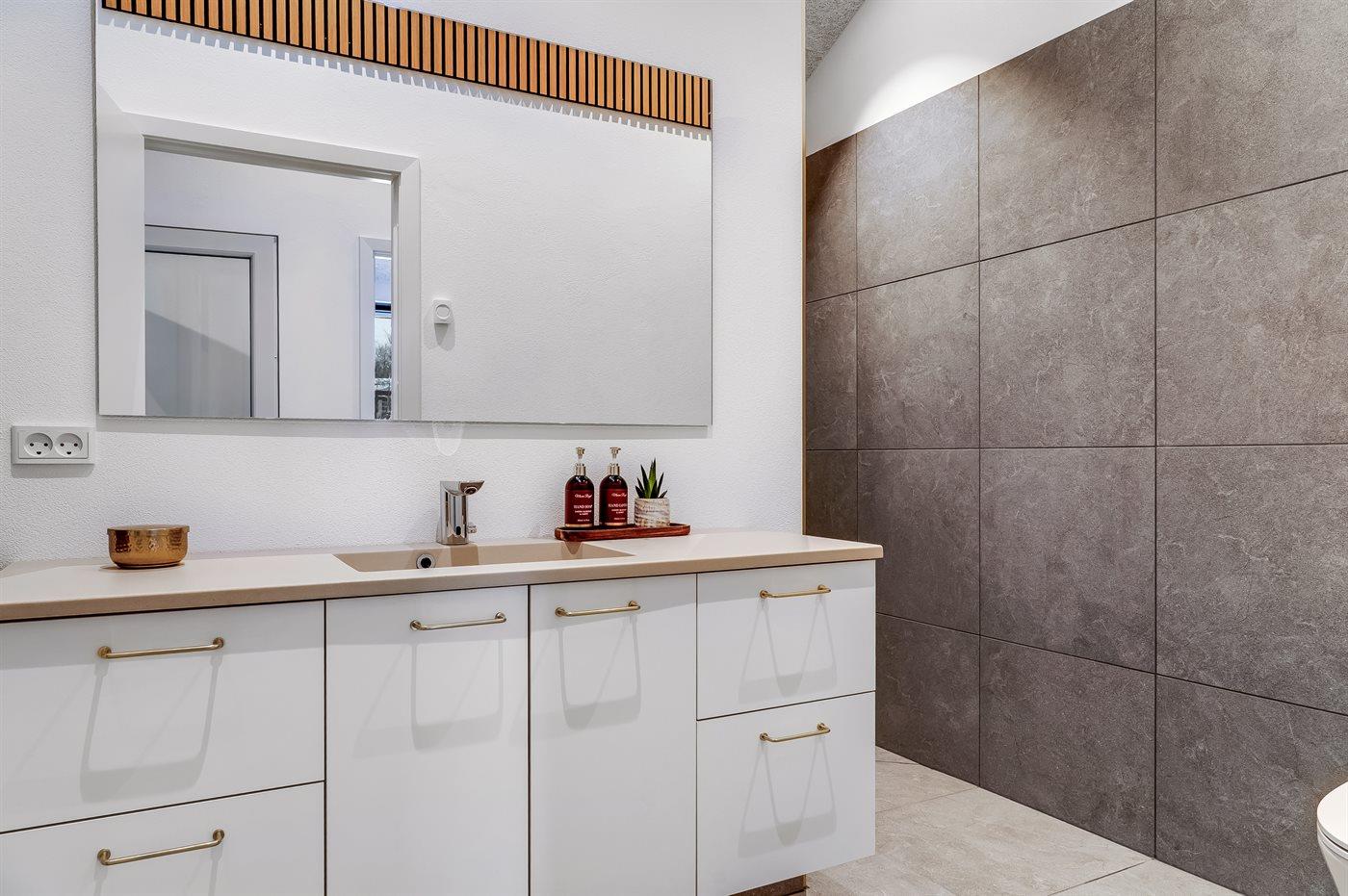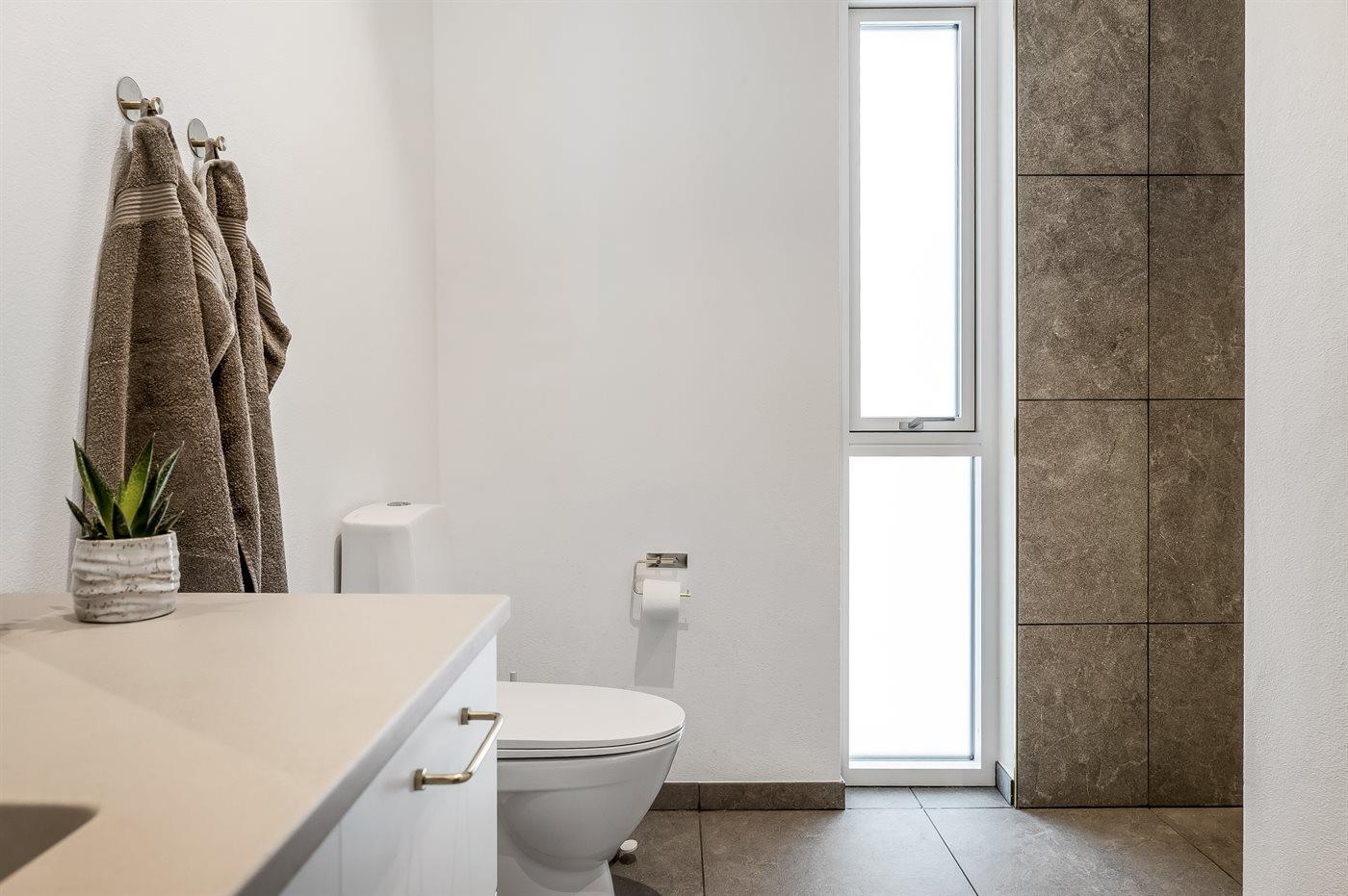 Der er 2 badeværelser med bruseniche og 3 toiletter, heraf 1 gæstetoilet. Der er gulvvarme på 2 badeværelser. Der er gulvvarme på gæstetoilettet.