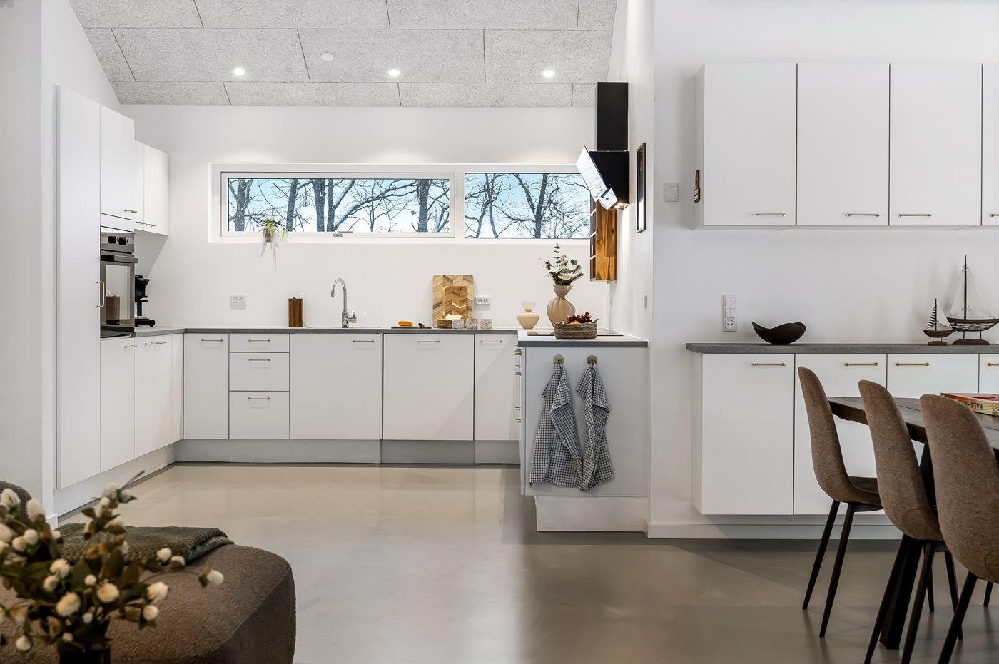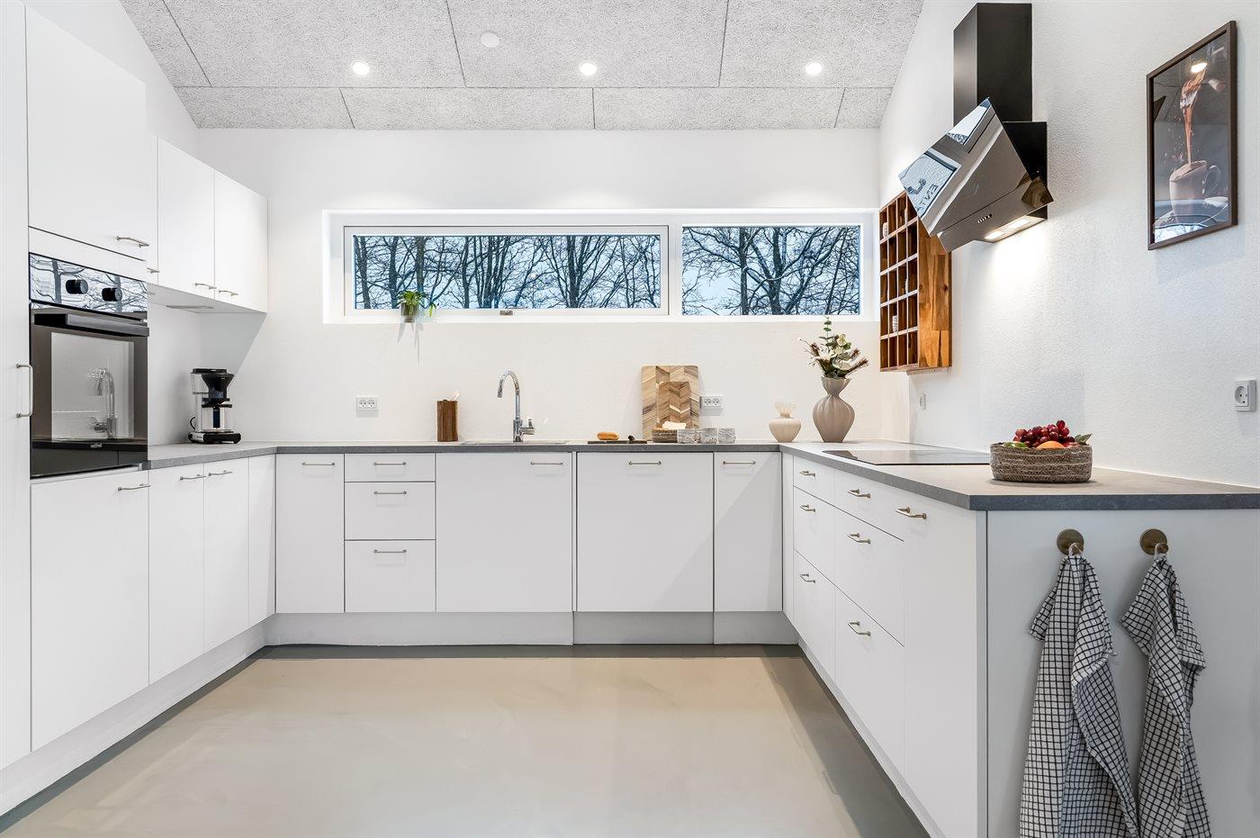 Køkkenet er udstyret med 1 køleskab. Der er 4 induktionskogeplader, varmluftovn, mikrobølgeovn samt opvaskemaskine.