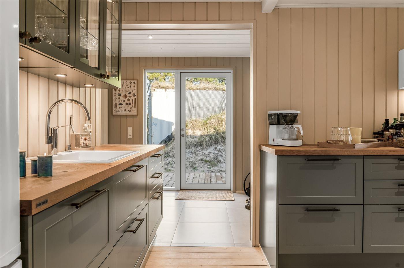 Køkkenet er udstyret med 1 køleskab. Der er 4 keramiske kogeplader, varmluftovn, mikrobølgeovn samt opvaskemaskine.