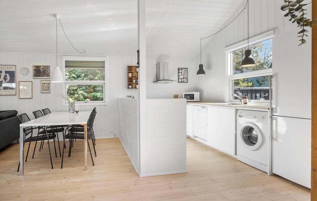 Omgivet af idylliske naturområder inviterer dette komfortable feriehus jer til at tilbringe hyggelige dage med familien. Her finder I et åbent, stilfuldt møbleret opholdsområde, hvor I altid kan nyde udsigten over de grønne områder. Lyt til brændeovnens stille knitren, mens I nyder maden og sæt jer senere godt til rette i sofaen med en god bog eller en film.