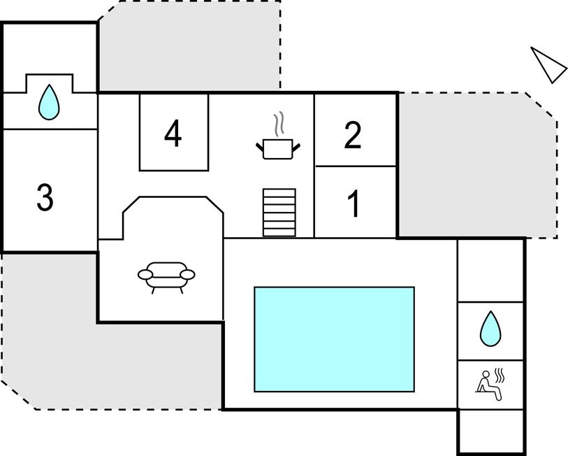 Huset råder over al moderne komfort. En af hovedattraktionerne er poolen, som kan ses fra både køkken/alrummet, stuen og to af husets tre terrasser. Den lyse poolafdeling indeholder udover den store pool et pænt badeværelse, sauna og stole til at slappe af i.