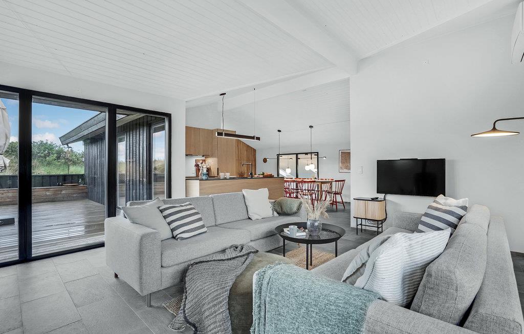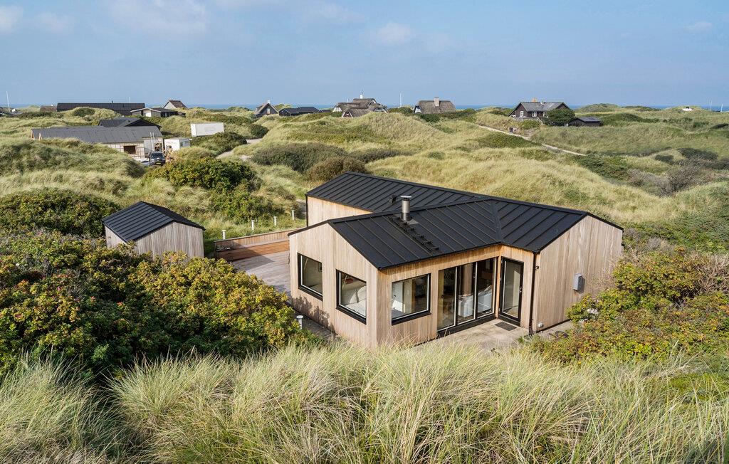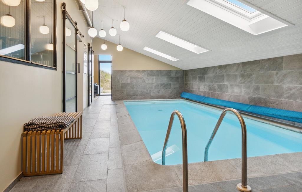 På en dejlig klitgrund få minutters gang fra Vesterhavet og med en fantastisk udsigt til havet og klitterne fra en bakketop på grunden, har dette skønne feriehus en perfekt beliggenhed. Det er bygget i forskudte plan. I træder ind i et lille bryggers og derfra direkte ind i den lyse poolafdeling med muret spabad og indgang til sauna og badeværelse. Fra poolrummet går I et par trin op til den hyggelige spiseafdeling, der ligger i forbindelse med et mindre, men fuldt udstyret køkken. For enden af rummet er der en hyggelig stue med behagelige møbler. Huset har loft til kip og trægulve på værelserne og resten af huset har opvarmede klinkegulve. Der hører dejlige såvel overdækkede som åbne træterrasser til huset.
