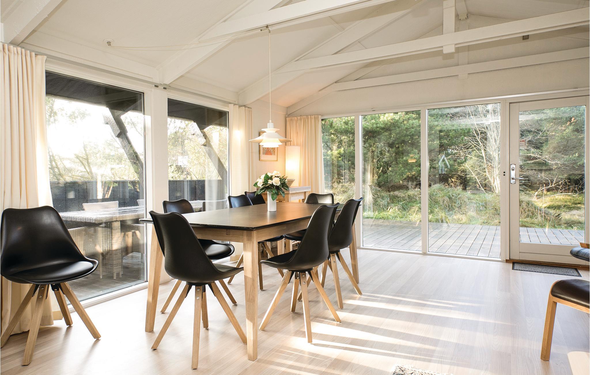 På en hyggelig kuperet grund med dejlig bevoksning, ligger dette hyggelige sommerhus med en indbydende ugenert terrasse. Huset er utroligt lyst og har trægulve overalt. Der er et praktisk moderne køkken i åben tilknytning til hyggelig spiseafdeling og pæn stue. Der er flere terrasser omkring huset, så I kan vælge sol, skygge, læ eller en brise, alt efter hvad I har lyst til. Skulle der komme en kølig aften, så tænd op i brændeovnen og nyd varmen, se en god film på det store tv, eller hvorfor ikke finde kortene eller et brætspil frem. Der er ca. fem km til nærmeste butik og under 40 km til Aalborg, hvor der altid er noget at se og opleve og et stort udvalg af restauranter, cafeer og butikker.