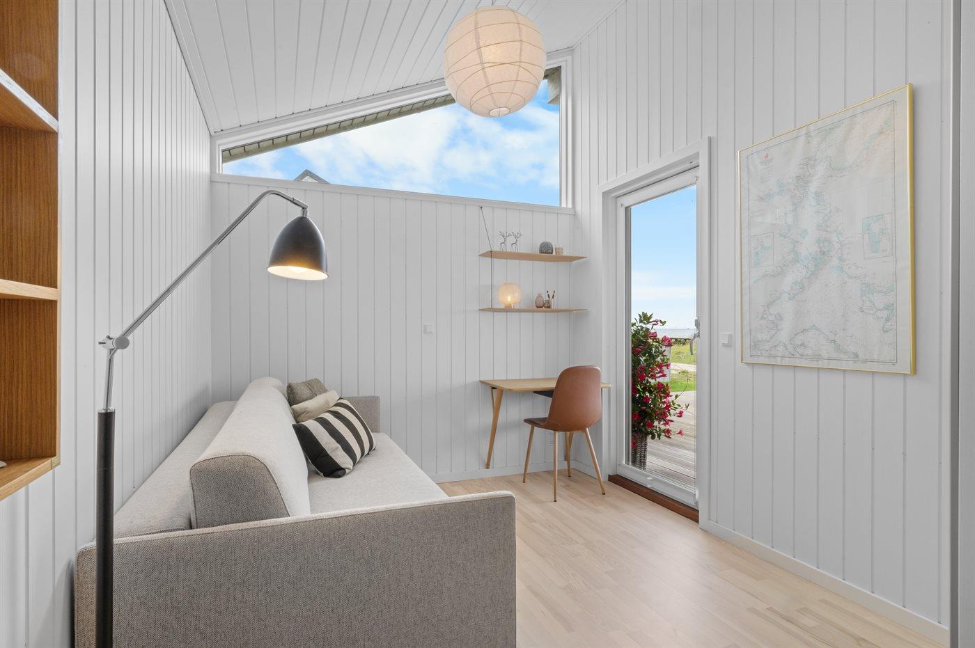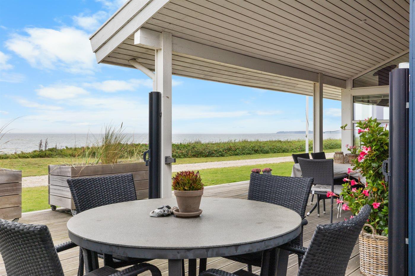 Flot sommerhus med havudsigt, stor overdækket terrasse og elbiloplader ved Sandager Næs.