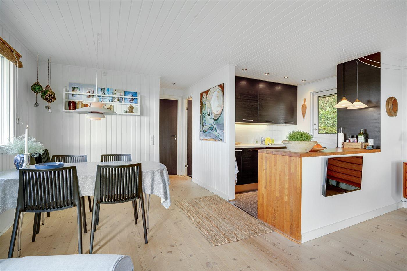 Køkkenet er udstyret med 1 køleskab. Der er 4 induktionskogeplader, varmluftovn samt opvaskemaskine.