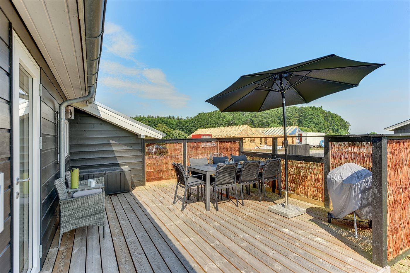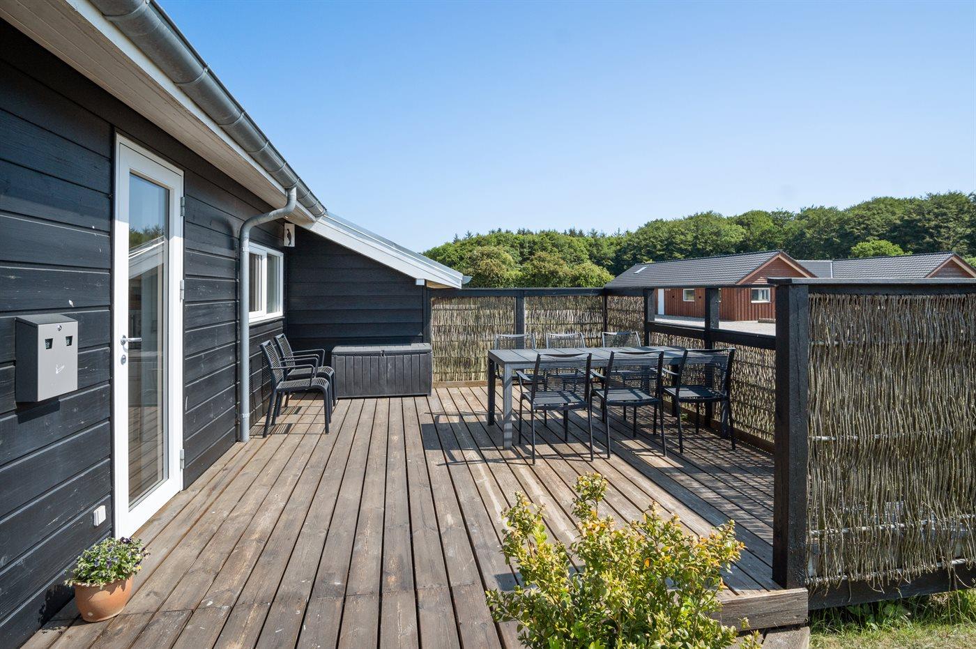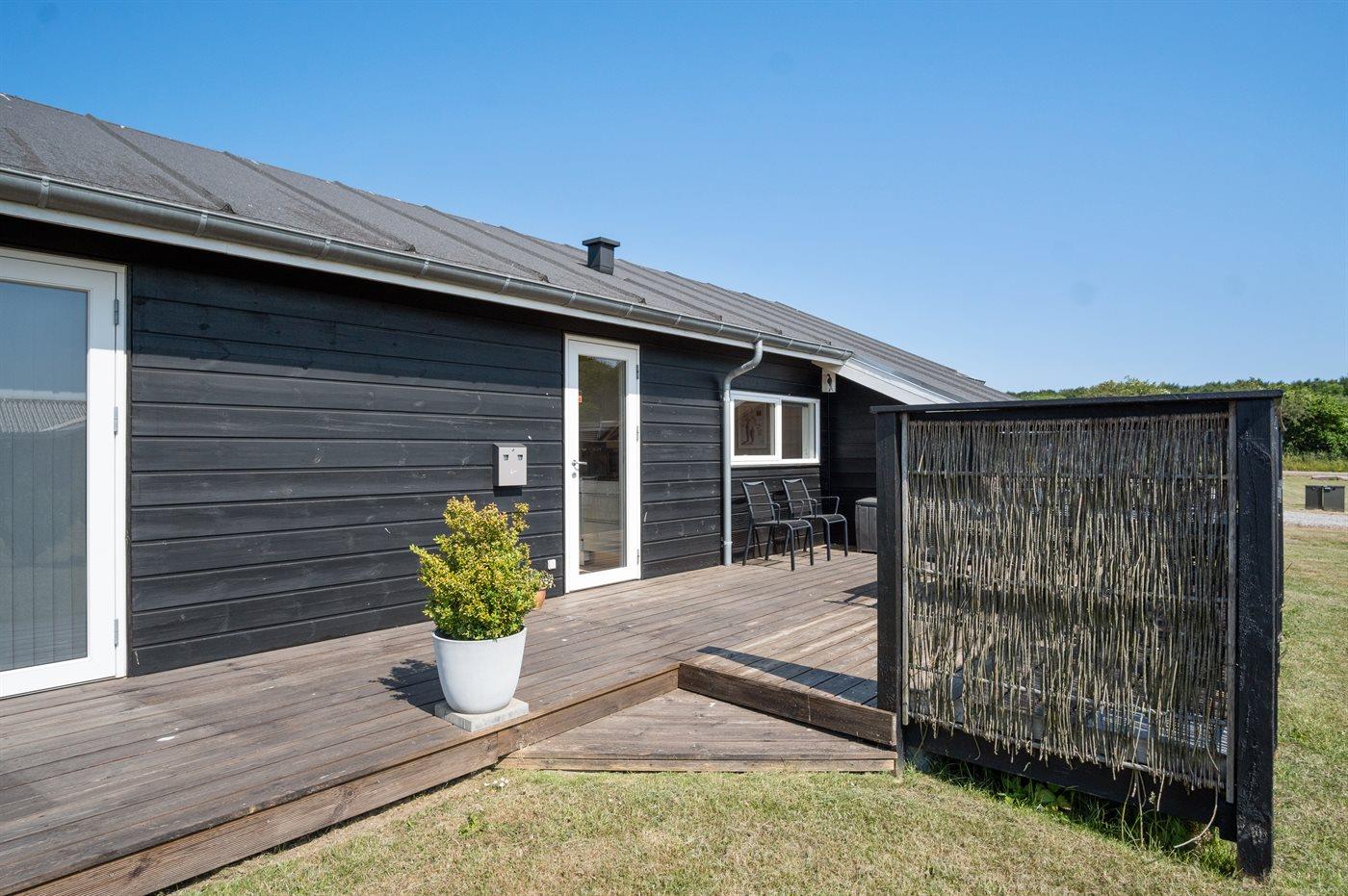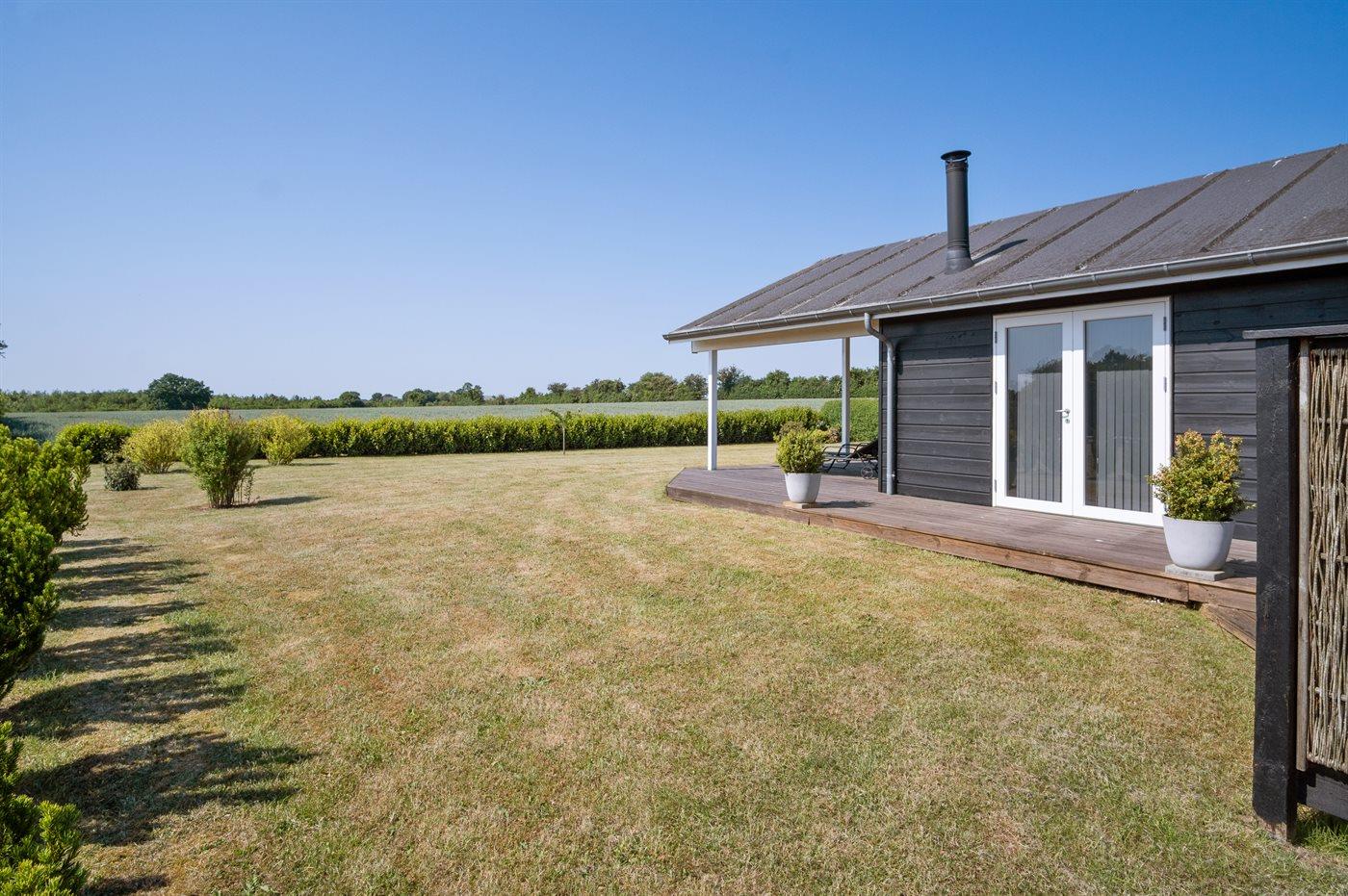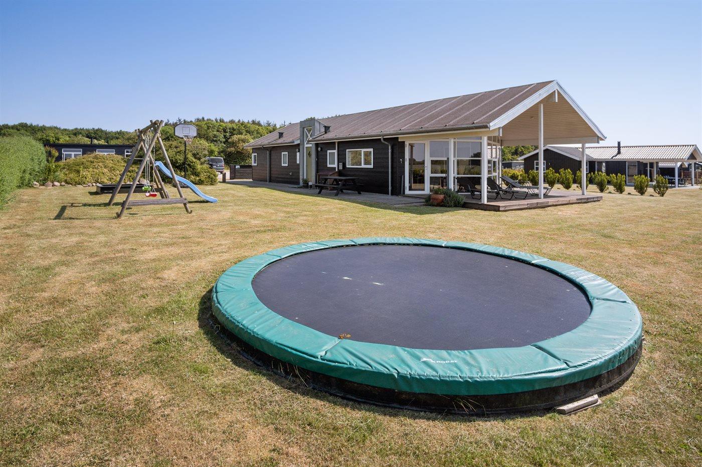 Ferieboligen er beliggende på en 1129 m² stor naturgrund. Der er 550 m til havet. Nærmeste forretning er beliggende i en afstand af 6700 m. Til ferieboligen hører 30 m² terrasseareal. Desuden er der 8 m² overdækket terrasse. Der er redskabsrum. Gynge. Sandkasse. Trampolin. Rutchebane. Der er installeret stik til opladning af elbil. Parkering ved ferieboligen.