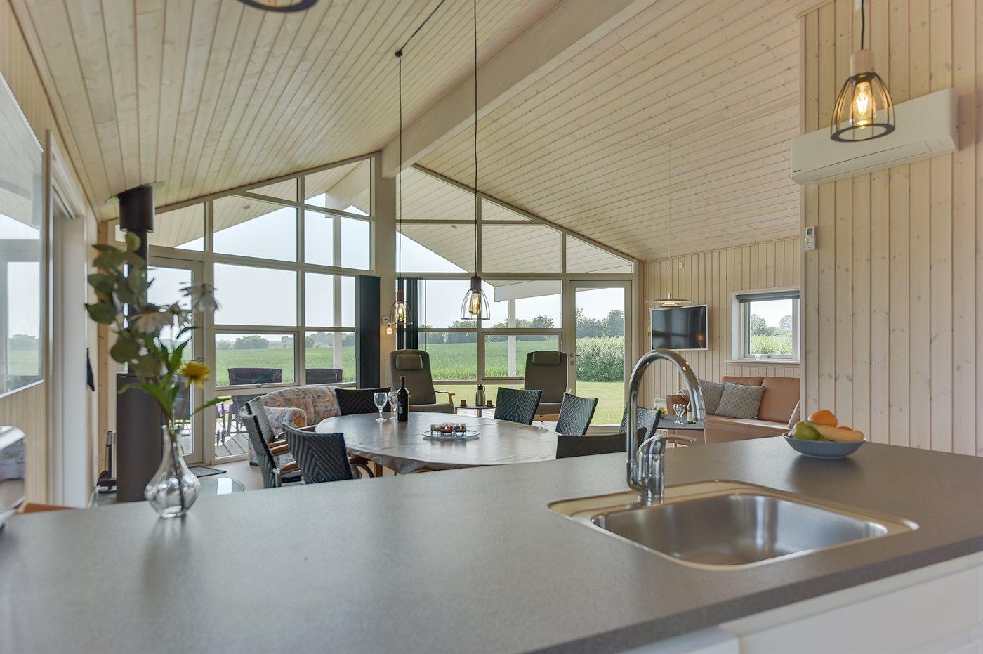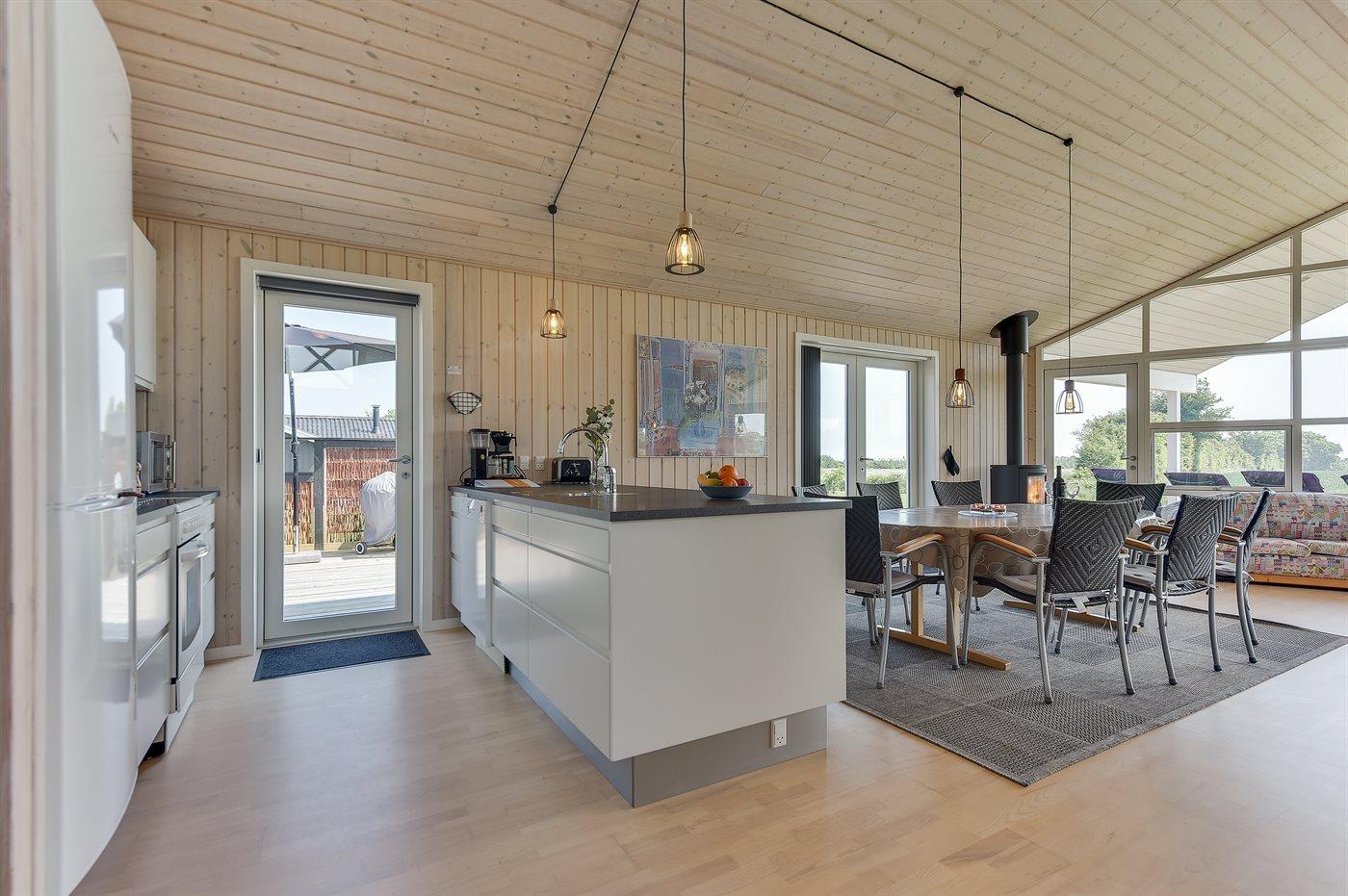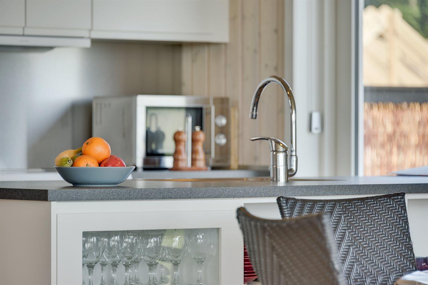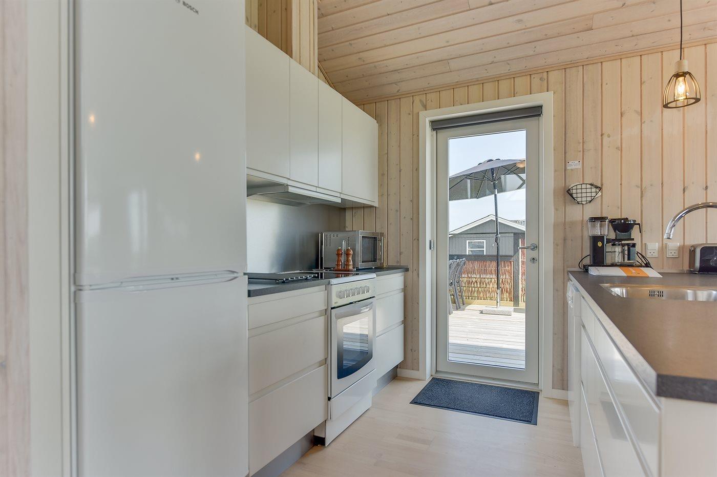 Køkkenet er udstyret med 1 køleskab. Der er 4 keramiske kogeplader, varmluftovn, mikrobølgeovn samt opvaskemaskine.