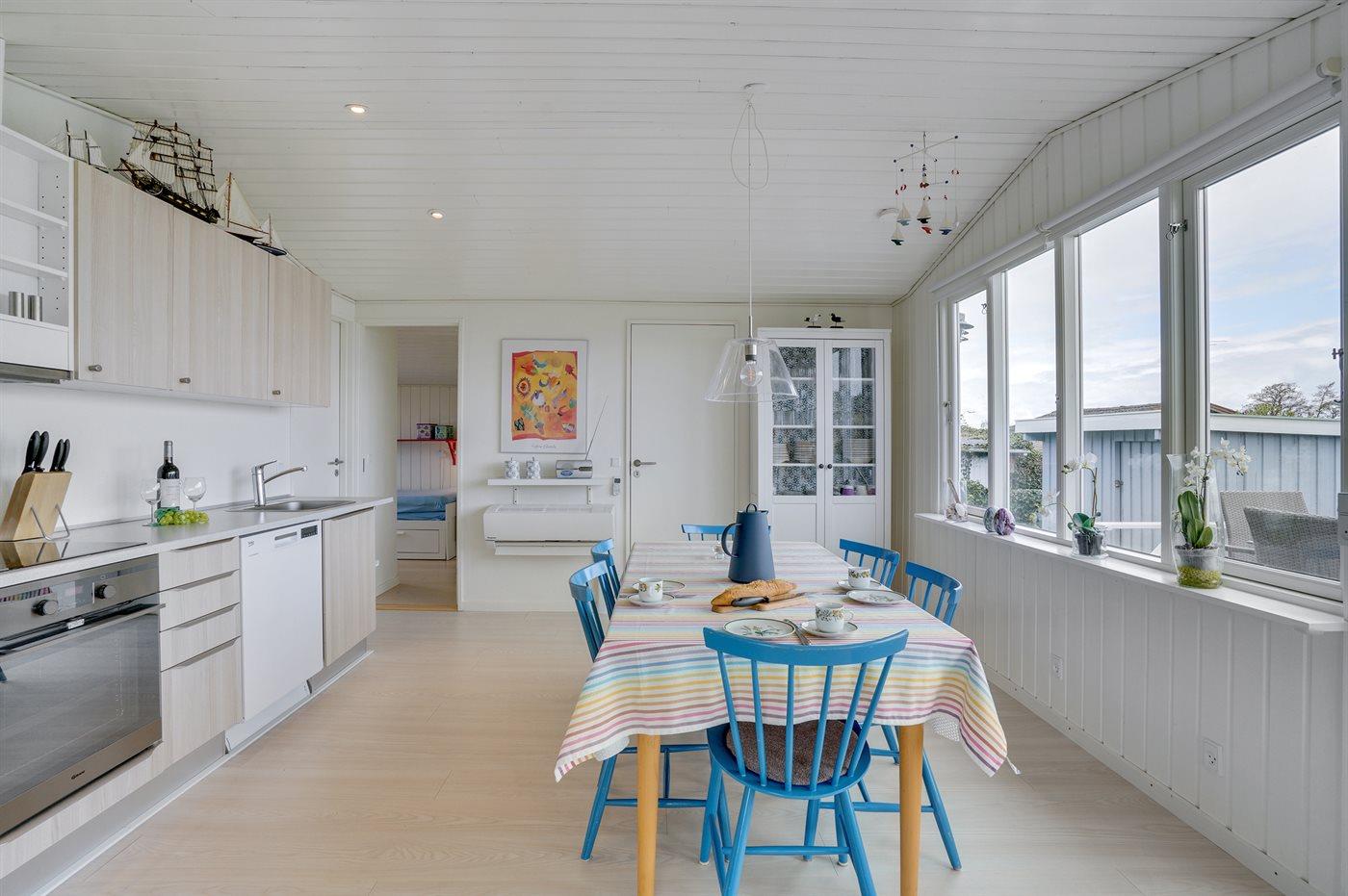 Køkkenet er udstyret med 1 køleskab. Der er 4 induktionskogeplader, varmluftovn, mikrobølgeovn.