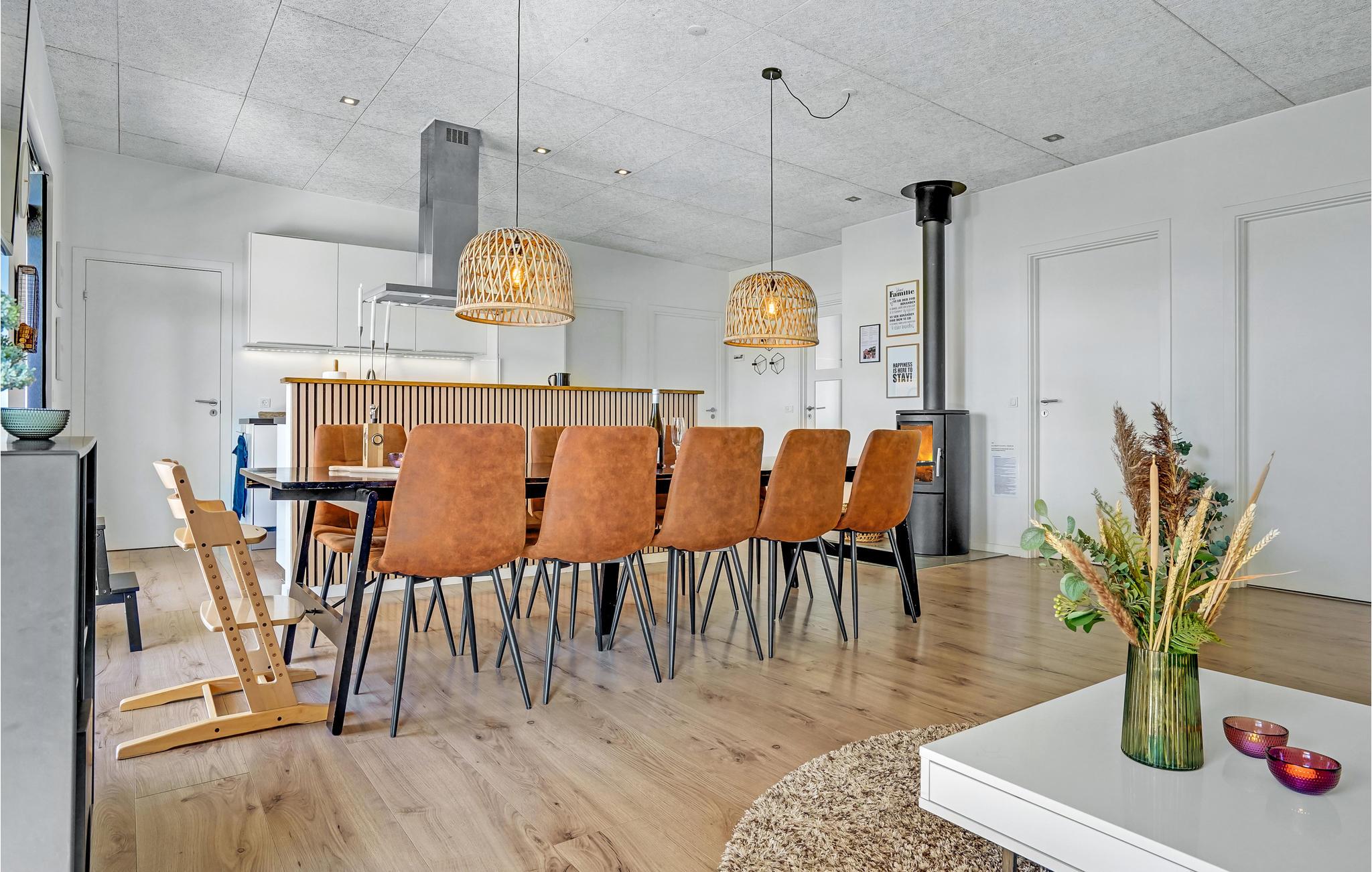 Huset er indrettet med et aktivitetsrum, hvor I kan få mange timer til at gå, her findes bl.a. billard, bordfodbold, bordtennis og spillemaskine. Det dejlige kombinerede køkken/alrum med opholdsstue har god plads til alle, og på kølige aftener kan I mødes omkring brændeovnen. I huset findes fem gode soverum, hvor køjesengene er monteret med rigtig gode boksmadrasser, så nattesøvnen er sikret. Værelserne er placeret i forskellige afdelinger af huset og alle værelser har eget TV, så det er ideelt for flere familier, der gerne vil holde ferie sammen. Desuden to flotte badeværelser, det ene indeholdende et dejligt 2-personers spabad og adgang til sauna.