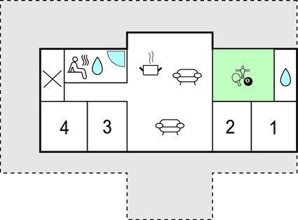 Huset er yderst velindrettet med en god rumfordeling, her er bl.a. afsat plads til indendørs aktiviteter som bordfodbold og PlayStation. Huset er perfekt indrettet til flere familier - med god plads til alle. Her findes 4 soveværelser, alle med gode dobbeltsenge. Værelserne er placeret i forskellige afdelinger af huset. På den store hems findes yderligere 2 gode sovepladser med udsigt til vand og krondyr i indhegning. Hele huset har gulvvarme og opvarmes af jordvarme, dermed billige varmeomkostninger.