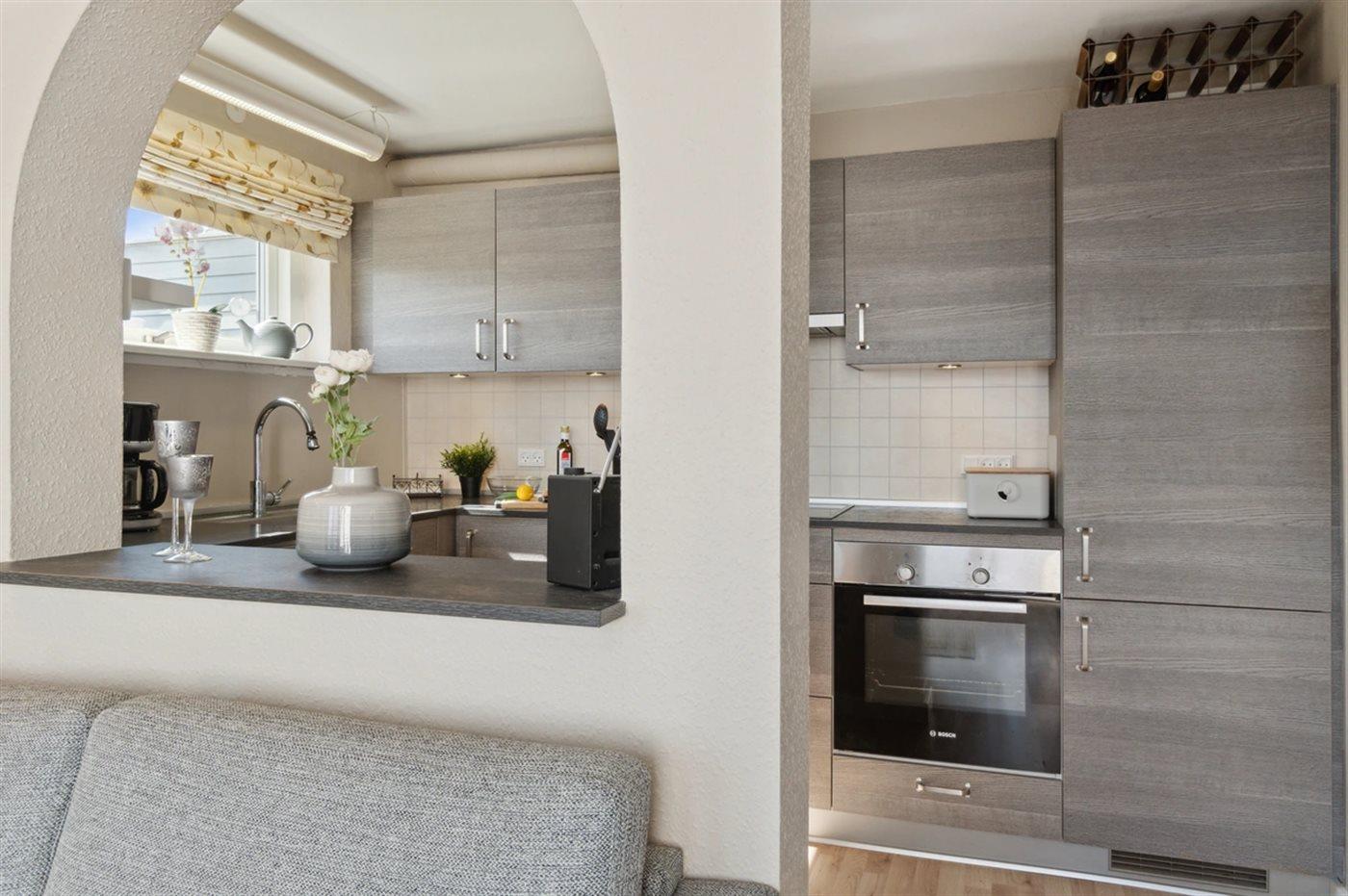Køkkenet er udstyret med 1 køleskab. Der er 4 induktionskogeplader, mikrobølgeovn samt opvaskemaskine.