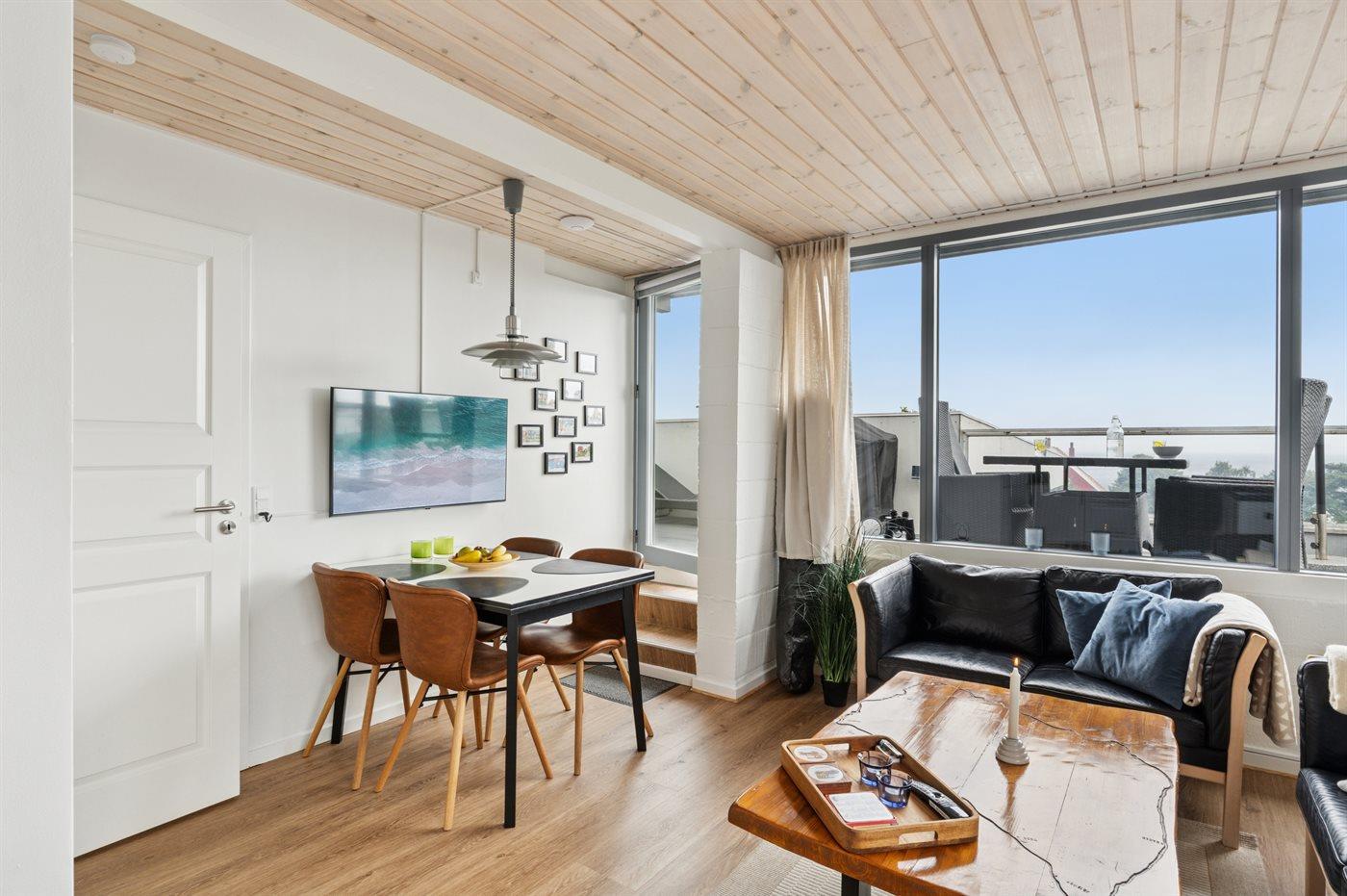 En ferielejlighed i en rækkebebyggelse med en fantastisk udsigt ud over vandet, både fra terrassen, som ligger ganske ugenert, og fra lejligheden.