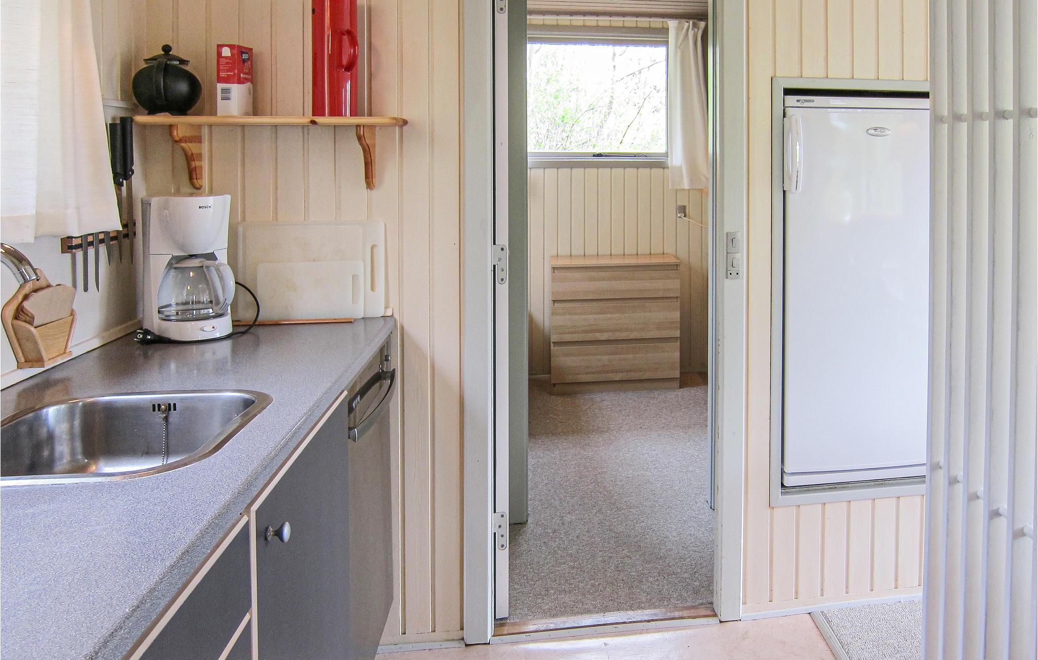 De fine trævægge indendørs skaber en hyggelig atmosfære, og indretningen er pæn og funktionel. I har mulighed for at tænde op i brændeovnen på kølige dage.