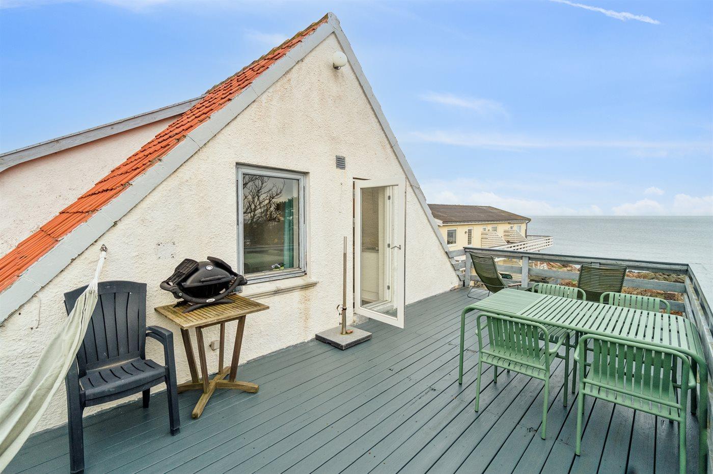 Til ferieboligen hører en stor, skøn tagterrasse med udsigt over havet og solnedgangen om sommeren.