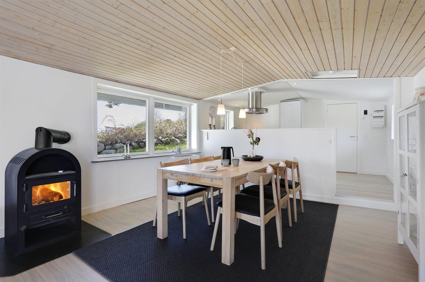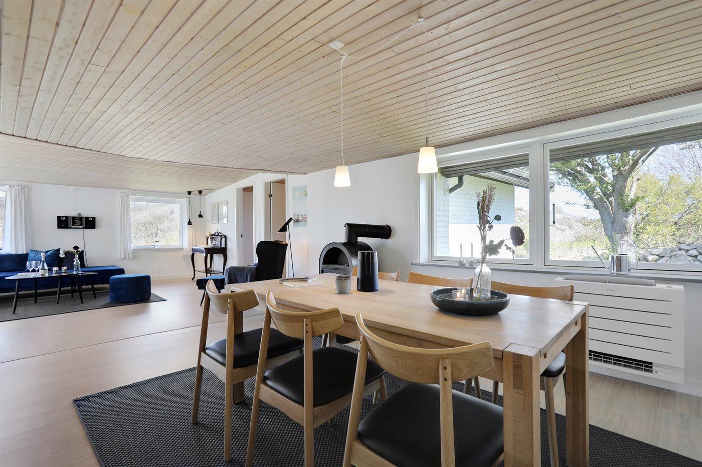 Dette sommerhus i sten ligger på en flot skråning med storslået udsigt over Hammerknuden og delvis havudsigt. Huset er moderniseret i 2022 med nyt køkken og badeværelse. Til huset hører en stor træterrasse med havemøbler. Bemærk: Udover 2 gode soveværelser findes der 2 sovepladser på en dobbelt sovesofa i opholdsstuen. Da huset ligger på en skråning kan det være uegnet for gangbesværede.