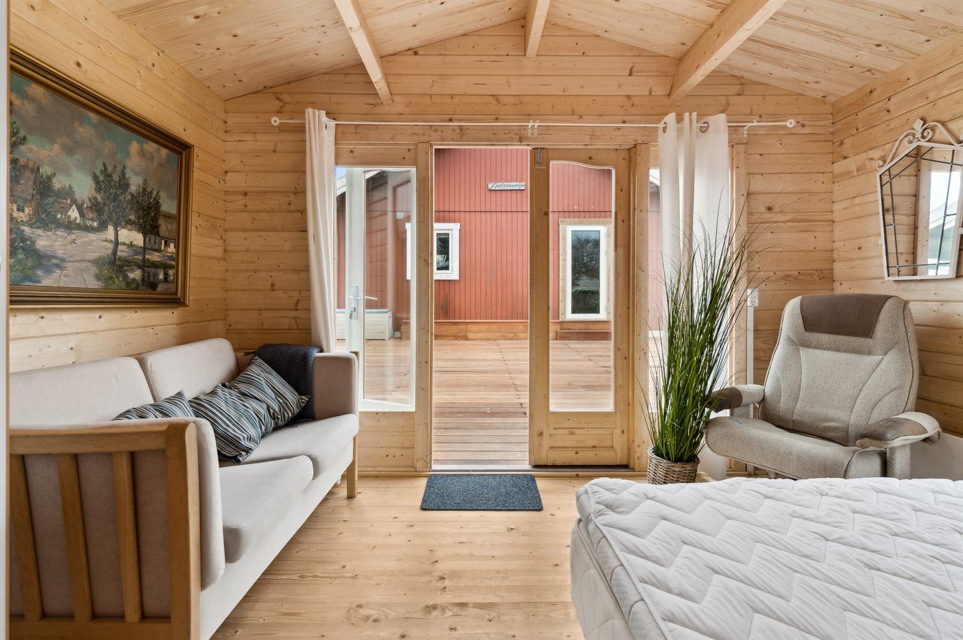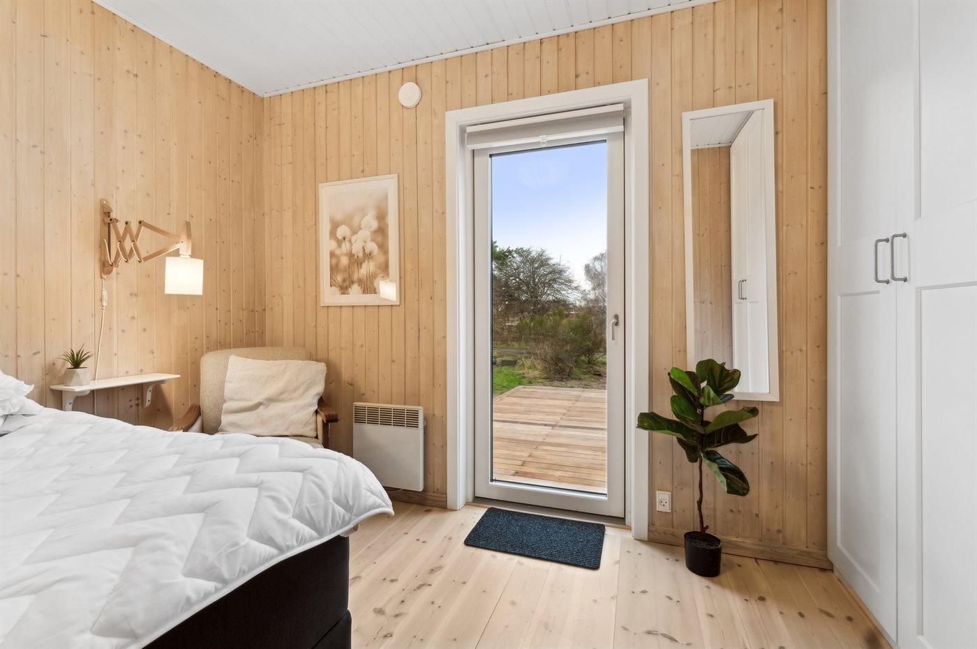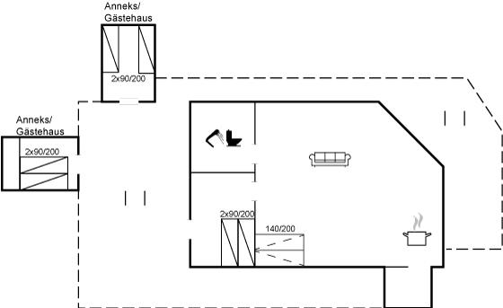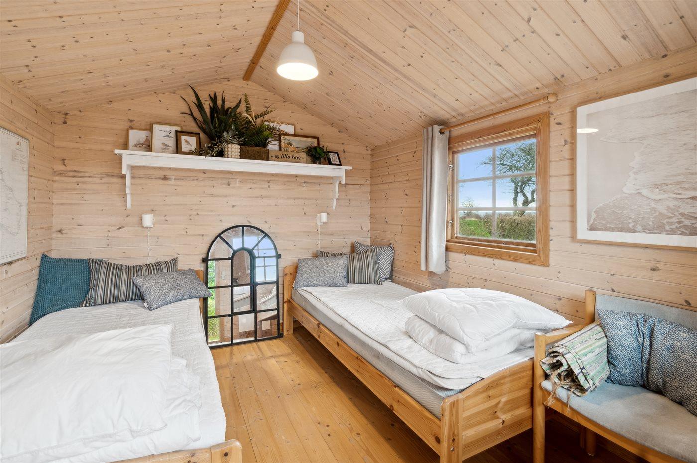 Sovepladserne fordeler sig på ét værelse med dobbeltseng i hovedhuset, én dobbelt sovesofa i opholdsstuen samt to annekser, hvoraf det ene er indrettet med dobbeltseng og det andet med 2 enkeltsenge. Hovedhus og annekser er naturligt bundet sammen af den store terrasse og terrassedøre, der sikrer, at man frit kan bevæge sig rundt.