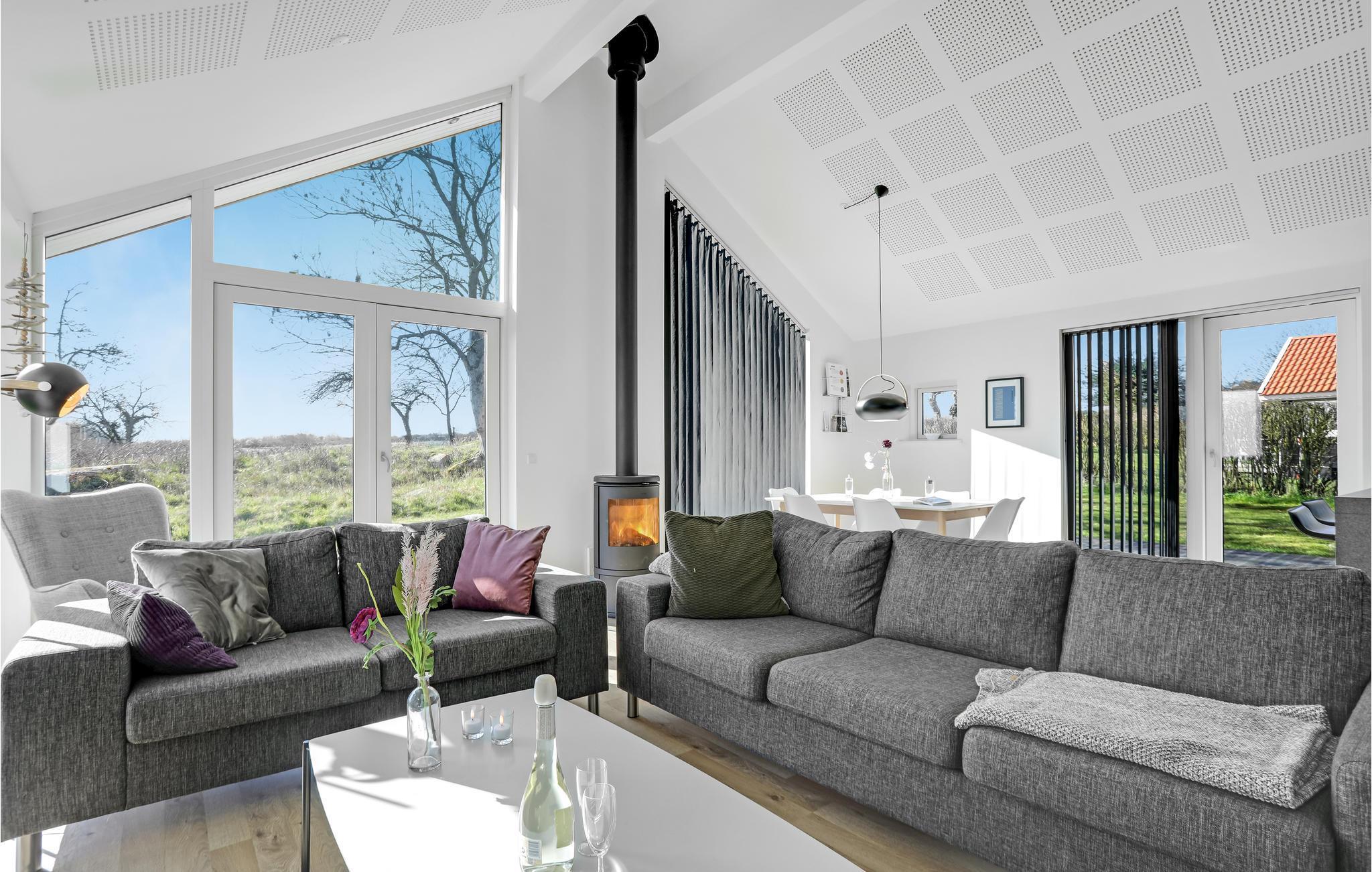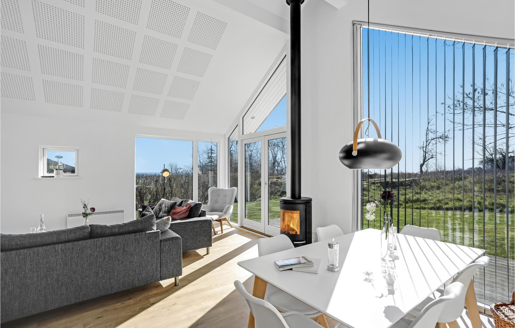 Huset er lyst og moderne indrettet. Åbent til kip skaber en rummelig og meget hyggelig atmosfære. Den dejlige opholdsstue er udstyret med komfortable møbler at flade ud i, en brændeovn til de køligere sæsoner, og fjernsyn med Apple TV til underholdning om aftenen og på regnfulde dage. Store glaspartier lukker meget lys ind og giver et dejligt udsyn til hav og grønne omgivelser. I det åbne og veludstyrede køkken er det nemt at tilberede lækre måltider. Der er gulvvarme på husets badedværelse.