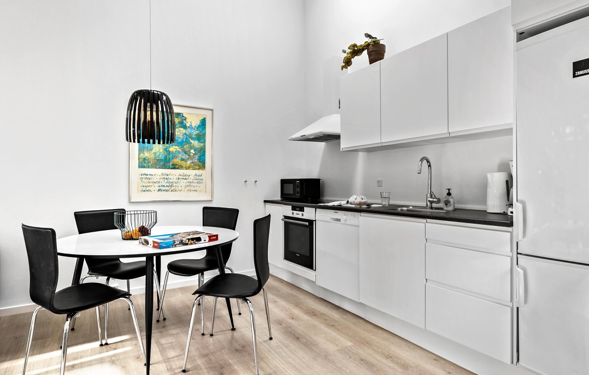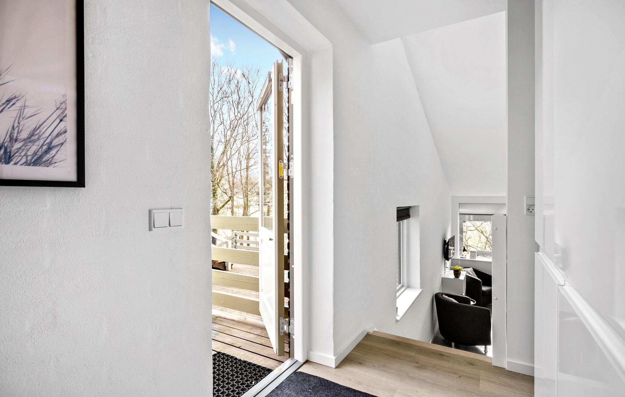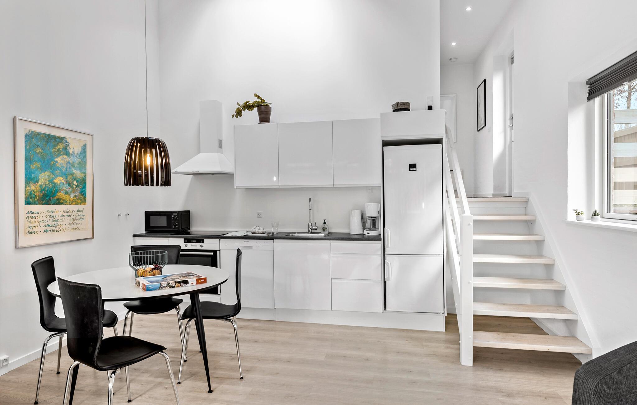Lejlighedens hjerte er den kombinerede køkken og opholdsstue, hvor nogle af jer kan slappe af i komfortable møbler foran fjernsynet, mens andre laver mad. Fra stuen er der udgang til en terrasse med havemøbler og grill, hvor I kan nyde solen og den friske havluft og tilberede lækre grillretter. Der er behagelig gulvvarme samt vaskemaskine på badeværelset. På 1. sal finder I et stort soveværelse med fire gode senge opdelt af en skillevæg; bemærk, at der er begrænsdet loftshøjde i den ene halvdel af rummet.
