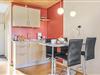 I kommer til at bo i en hyggelig, aflang etværelseslejlighed, som er lyst og moderne indrettet. Rummet er fint inddelt i små sektioner, så I har dobbeltsengen i den ene ende, mens den anden halvdel består af et åbent køkken med en lille spiseplads.