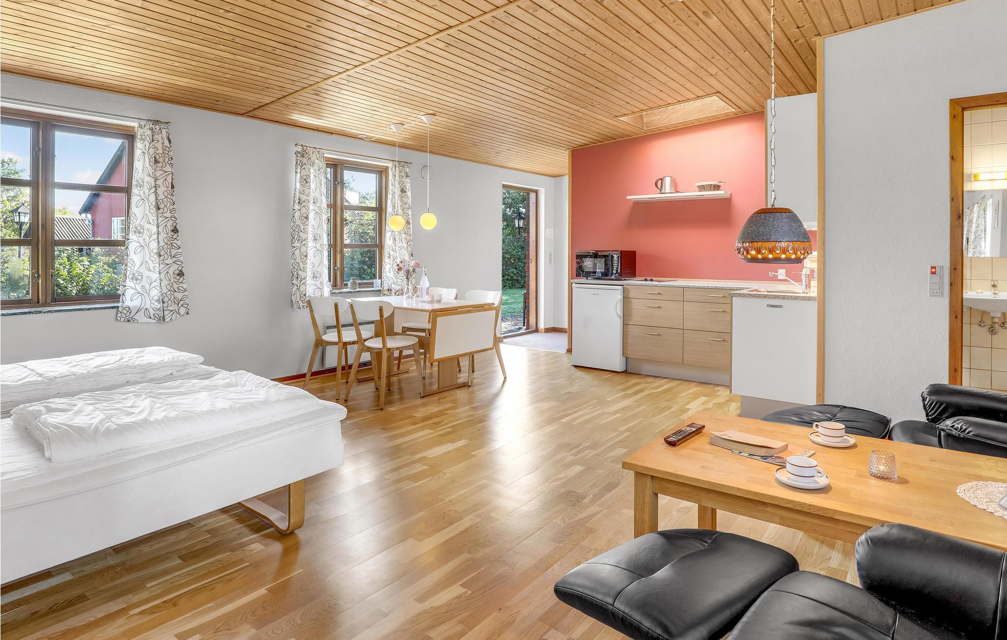 I kommer til at bo i en rummelig etværelseslejlighed, som er lyst og komfortabelt indrettet. Rummet er fint inddelt i små sektioner, så I har dobbeltsengen i den ene del samt et køkkenhjørne med spiseplads og en krog med bløde møbler, hvor I kan slappe af om aftenen. På sovesofaen kan I også rede op til en tredje gæst.