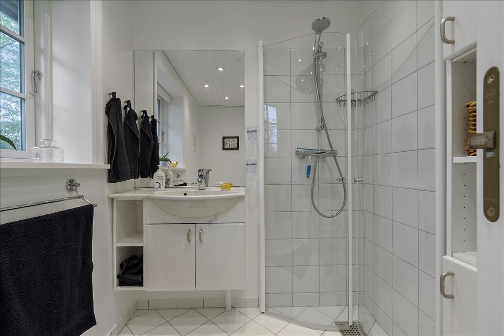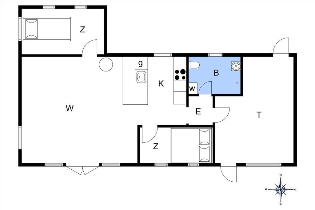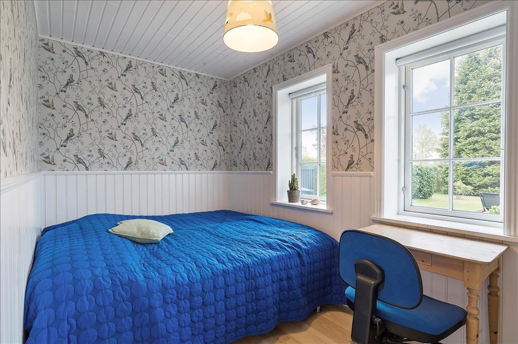 Når du træder ind via den hyggelige overdækkede terrasse, mødes du af en lys og indbydende atmosfære. Entréen leder dig direkte ind i et åbent køkken-alrum, hvor køkkenet smelter sammen med stuen. Her kan du tilberede lækre måltider, mens du stadig er en del af samtalen i stuen. Spisepladsen ved udgangen til terrassen er det perfekte sted at nyde morgenkaffen med udsigt til haven. I stuen inviterer en komfortabel sofagruppe til afslapning foran brændeovnen, der spreder varme og hygge på kølige aftener. Sommerhuset rummer to charmerende soveværelser, begge udstyret med dobbeltsenge, der sikrer en god nats søvn. Badeværelset er funktionelt indrettet med brusekabine og vaskemaskine, hvilket gør det nemt at håndtere hverdagens praktiske gøremål.