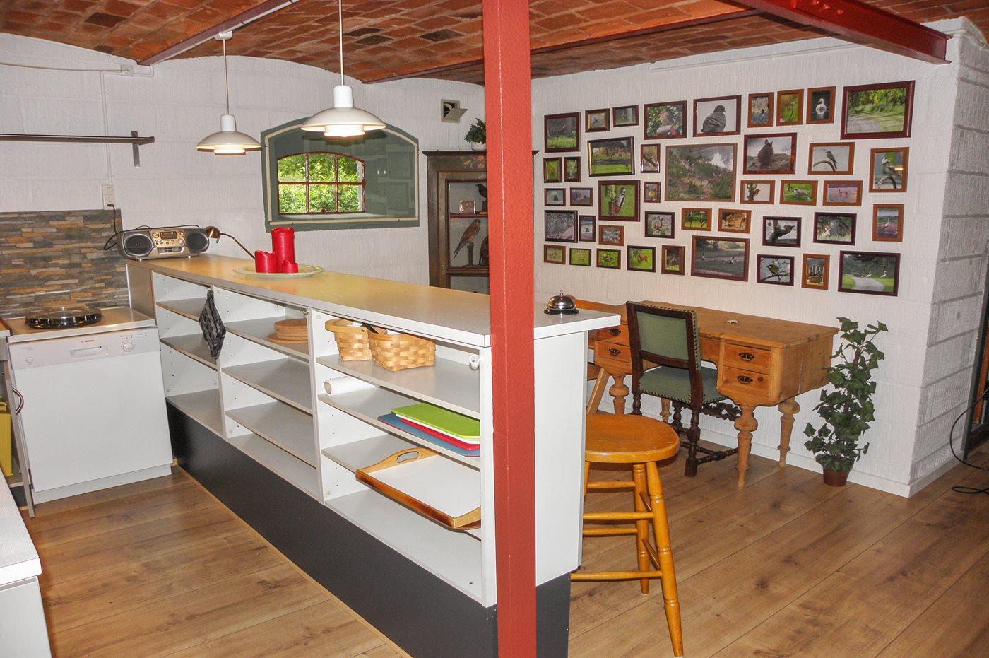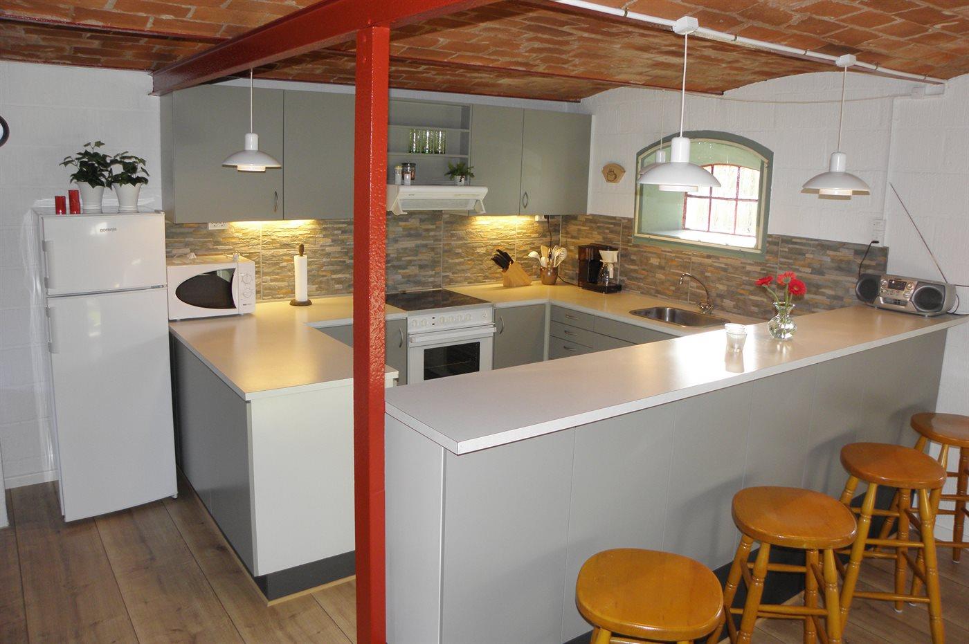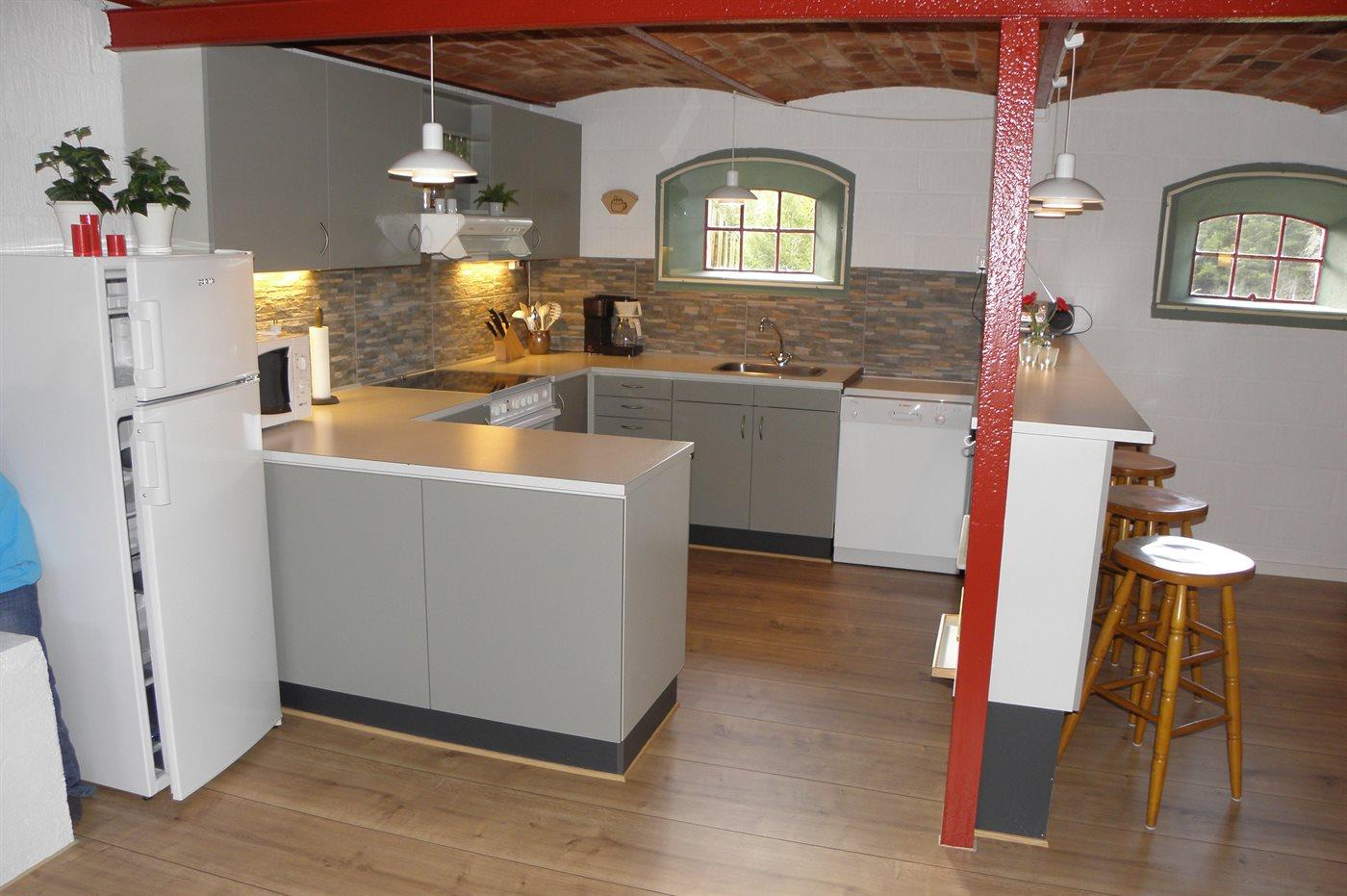 Køkkenet er udstyret med 1 køleskab. Der er 4 elkogeplader, varmluftovn, mikrobølgeovn samt opvaskemaskine.