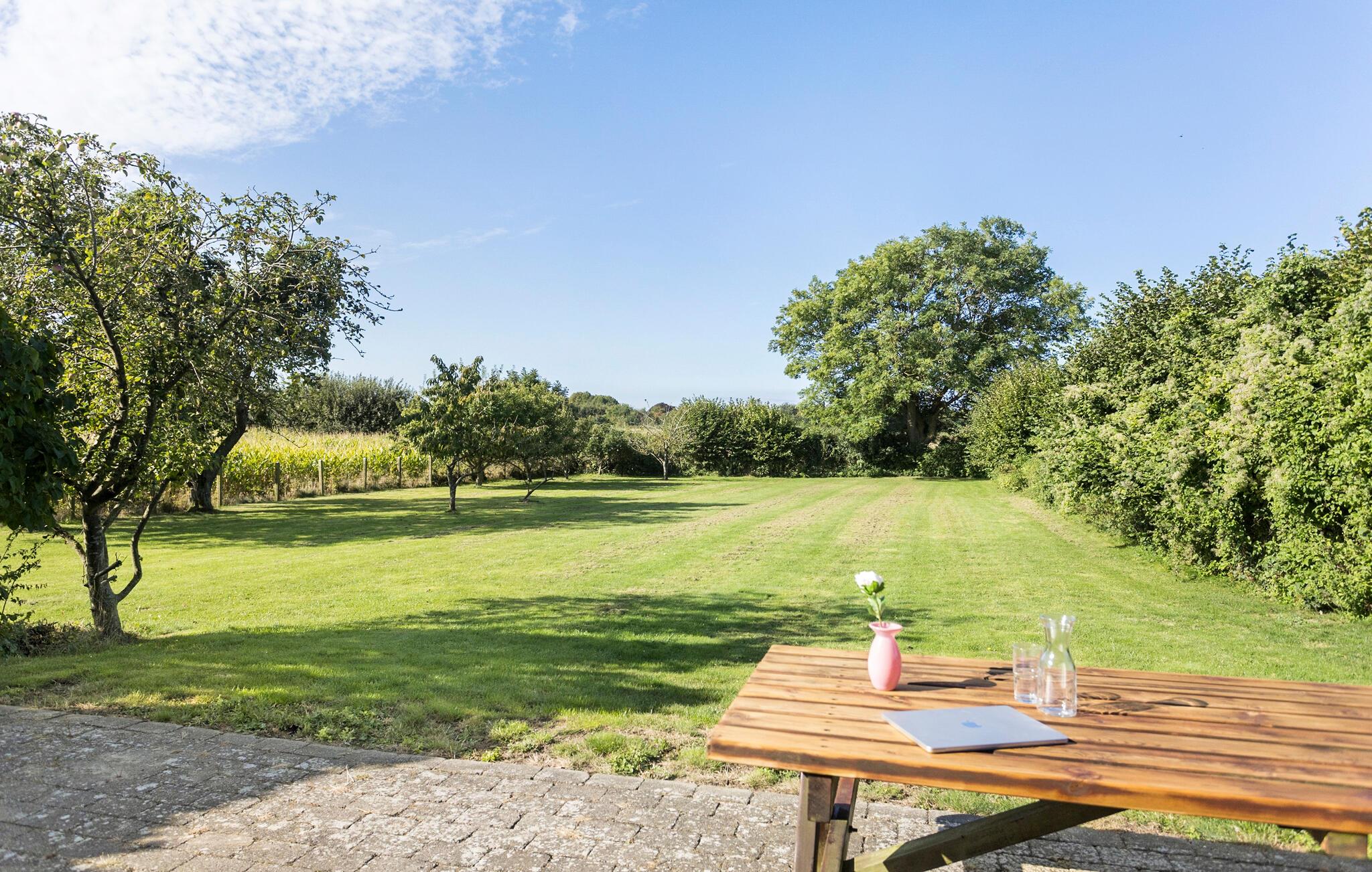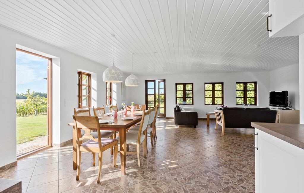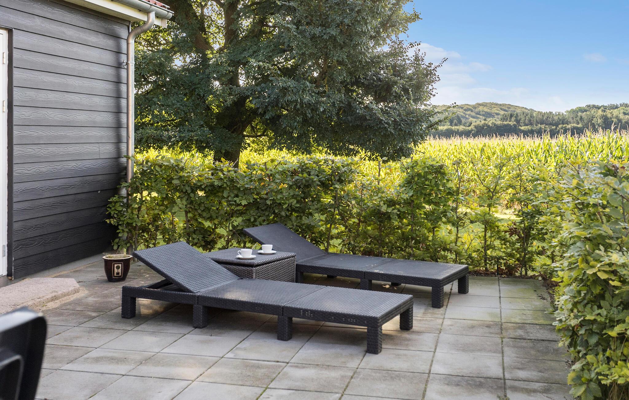 På en lun dag kan I tænde op i grillen og sætte jer ud på terrassen, som er flot indrammet af den grønne have. Den store naturgrund med græs og frugttræer deler I med rådyr og dådyr fra området.