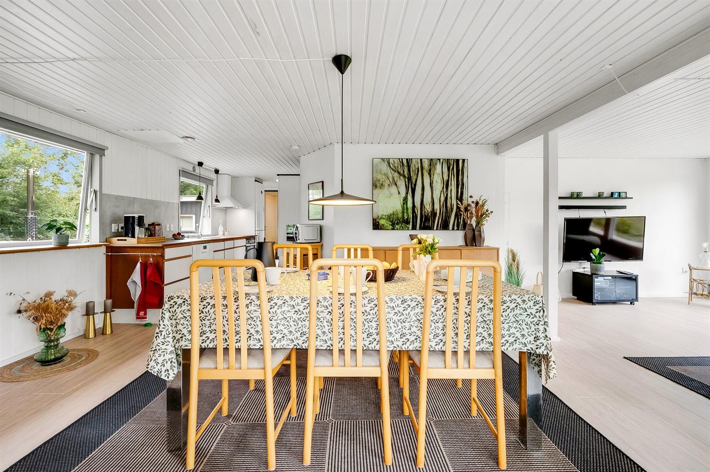 Køkkenet er udstyret med 1 køleskab. Der er 4 induktionskogeplader, varmluftovn, mikrobølgeovn samt opvaskemaskine.