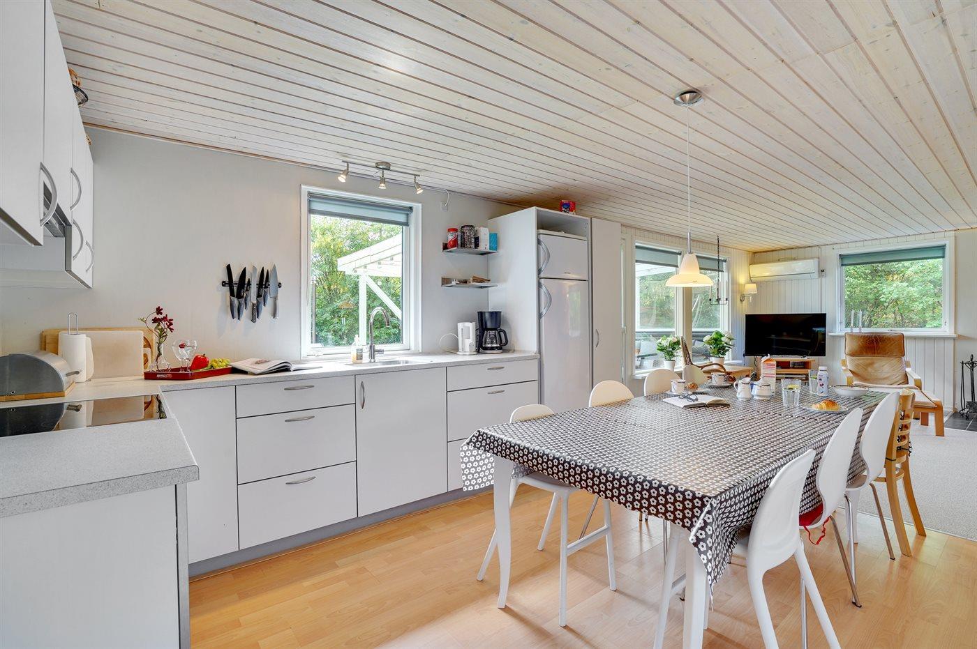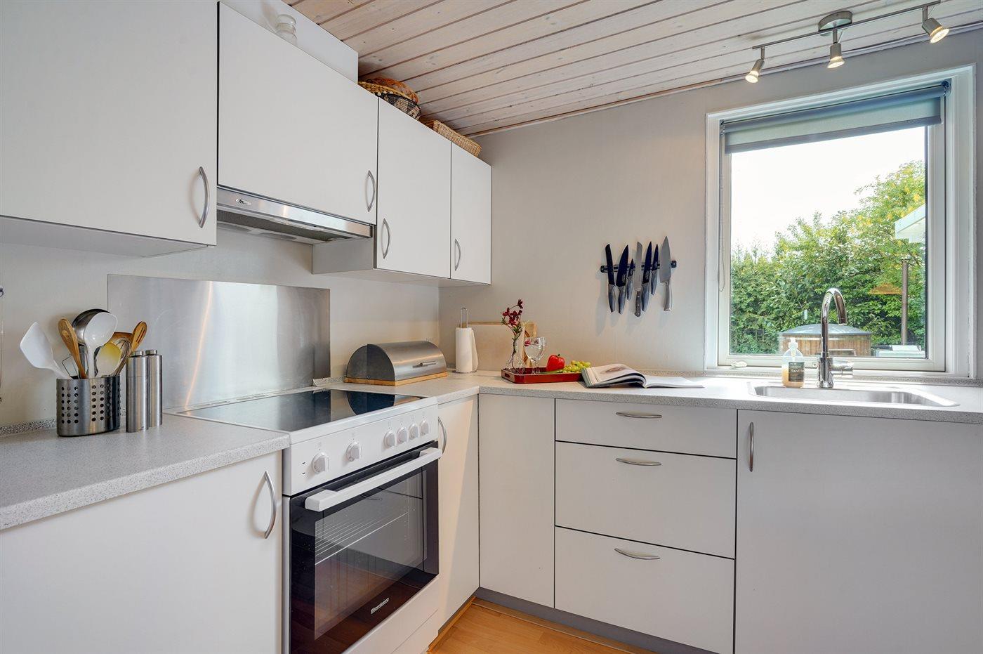 Køkkenet er udstyret med 1 køleskab. Der er 4 keramiske kogeplader, varmluftovn.