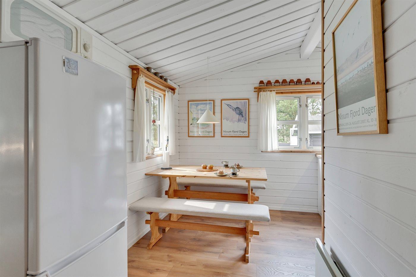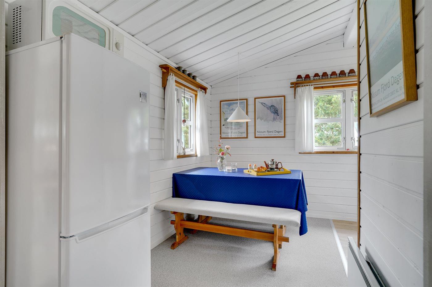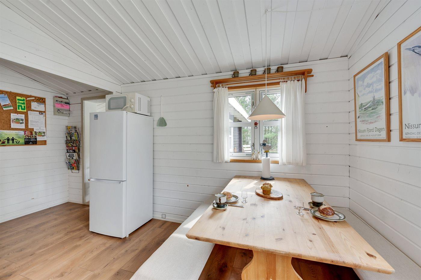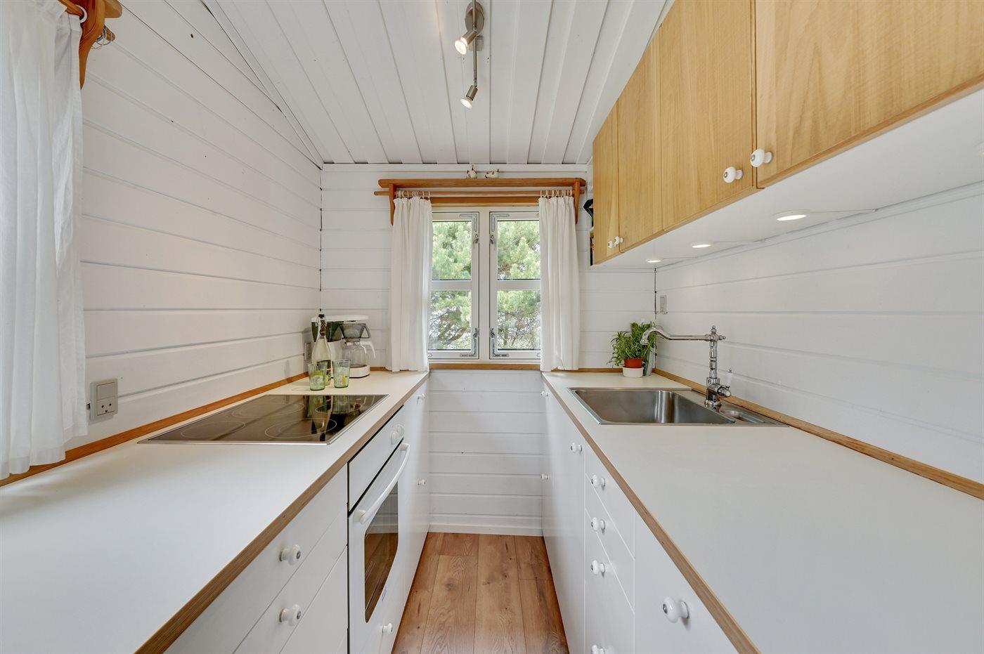 Køkkenet er udstyret med 1 køleskab. Der er 4 keramiske kogeplader, varmluftovn, mikrobølgeovn.
