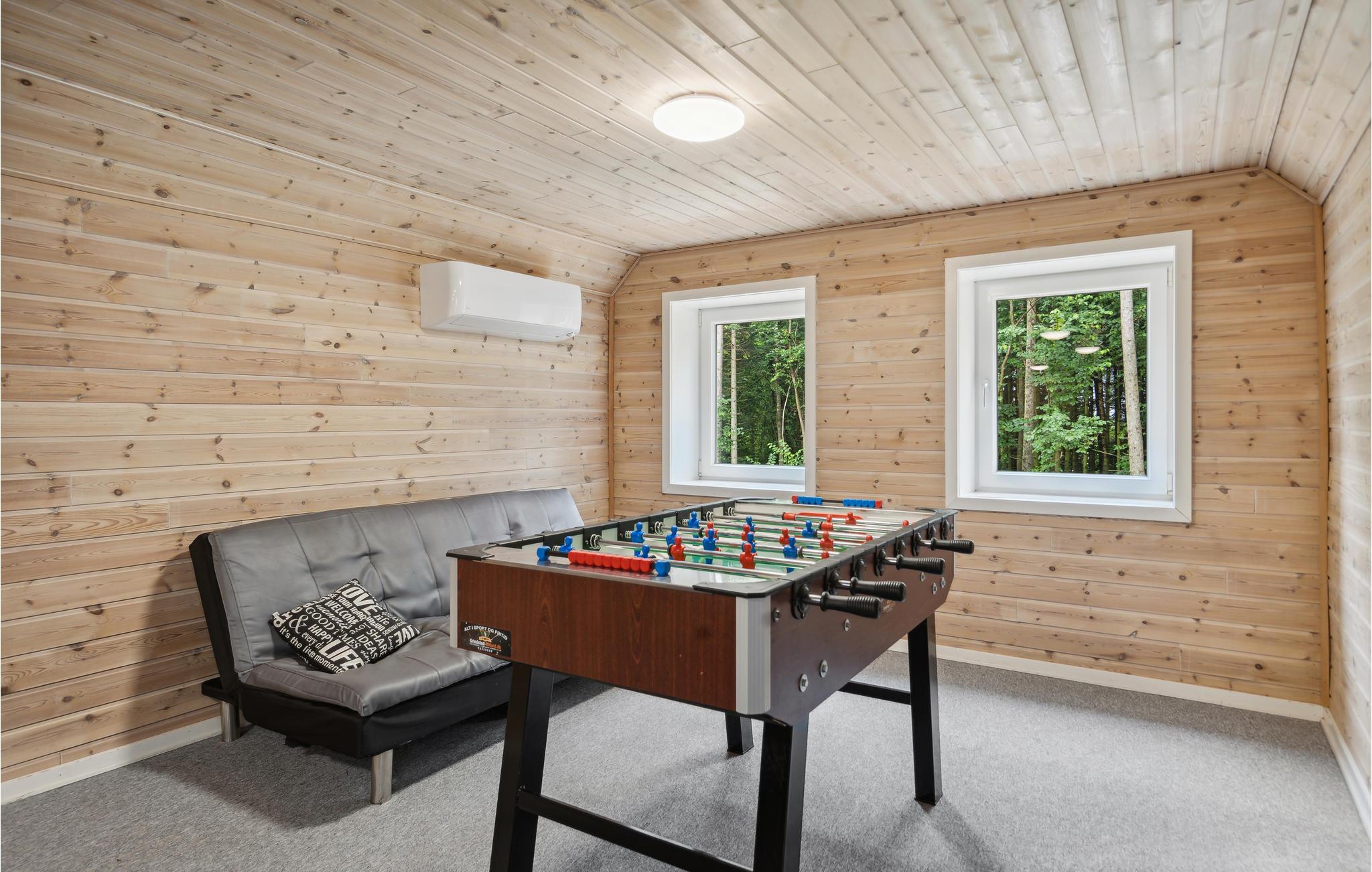 Der er installeret en pillebrændeovn, hvilket gør at udgifterne til opvarmning minimeres. I aktivitetsrummet kan I dyste ved poolbordet i airhockey samt bordfodbold. Til huset hører en lukket, delvis overdækket gårdhave med bordtennis samt flere spil.