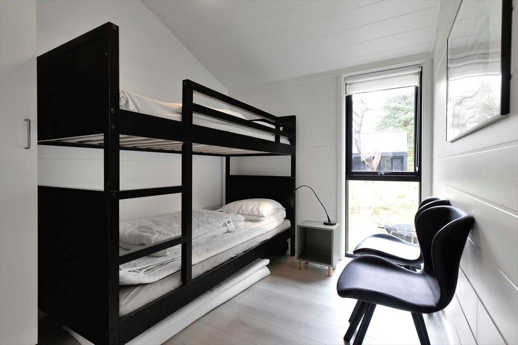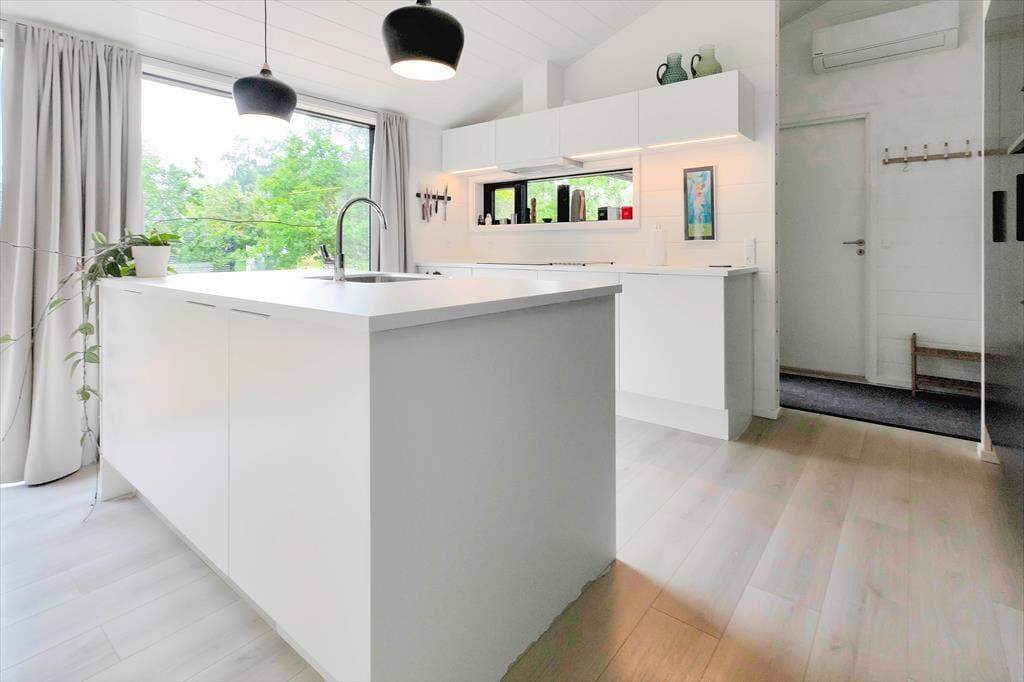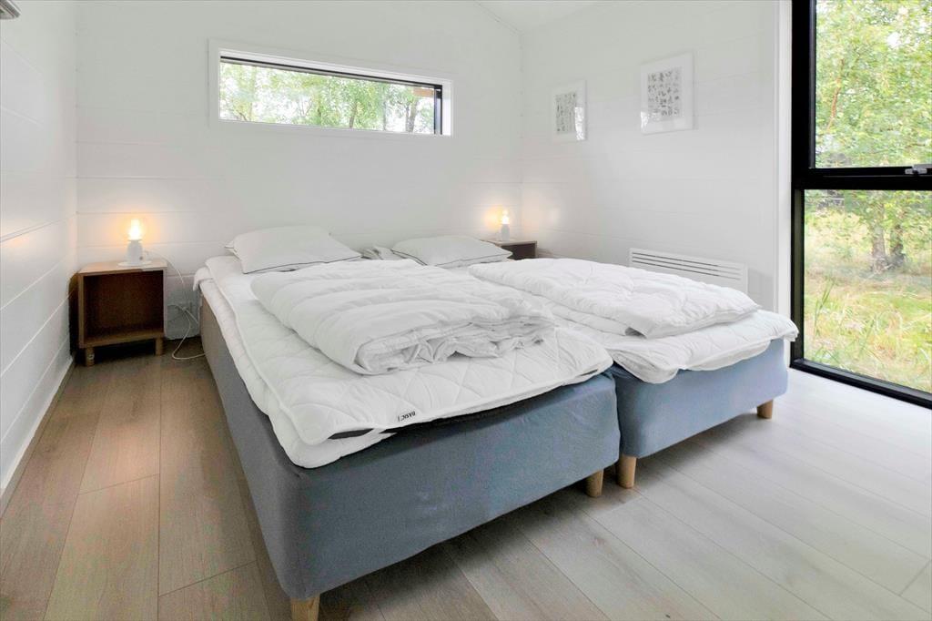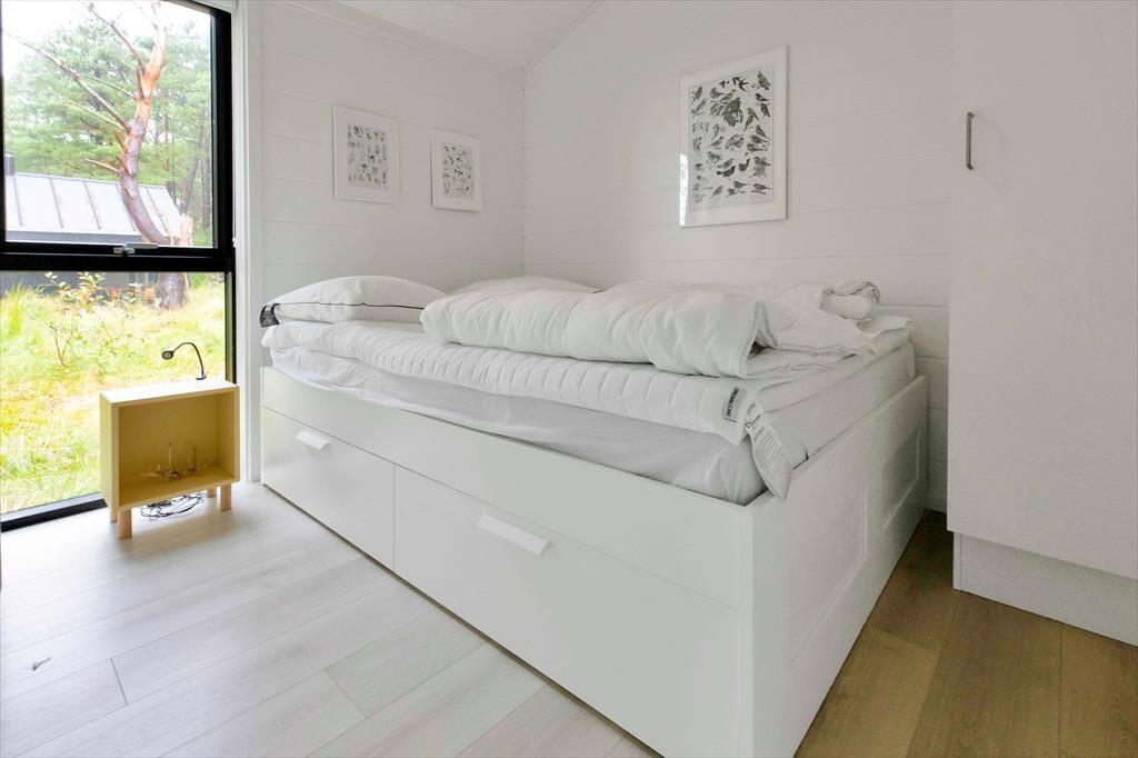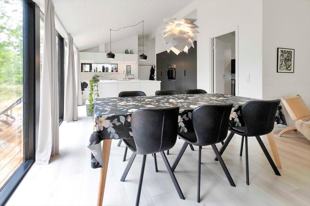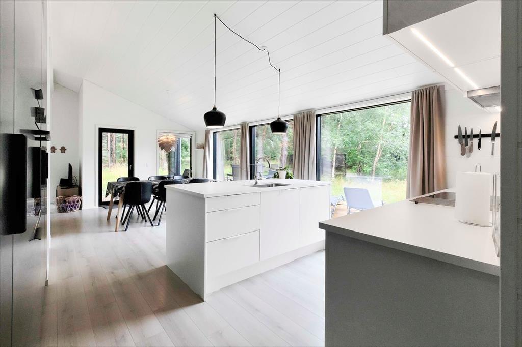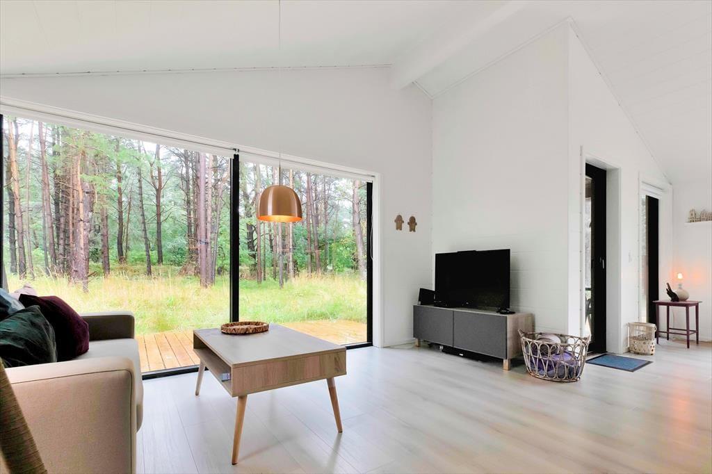I sommerhuset, vil du med det samme få følelsen af at være velkommen, alt fremstår lyst, nyt, lækkert og særdeles indbydende. Du vil hurtigt få skuldrene ned og mærke, at det endelig er tid til ferie. I den dejlige stue, der er placeret i forbindelse med det åbne køkken, kan I samles omkring spisebordet til et brætspil eller en god frokost. Fra terrassen kan du opleve den fantastiske natur og være heldig at se et rådyr gå forbi, mens I deler en flaske vin, efter at børnene er lagt i seng.