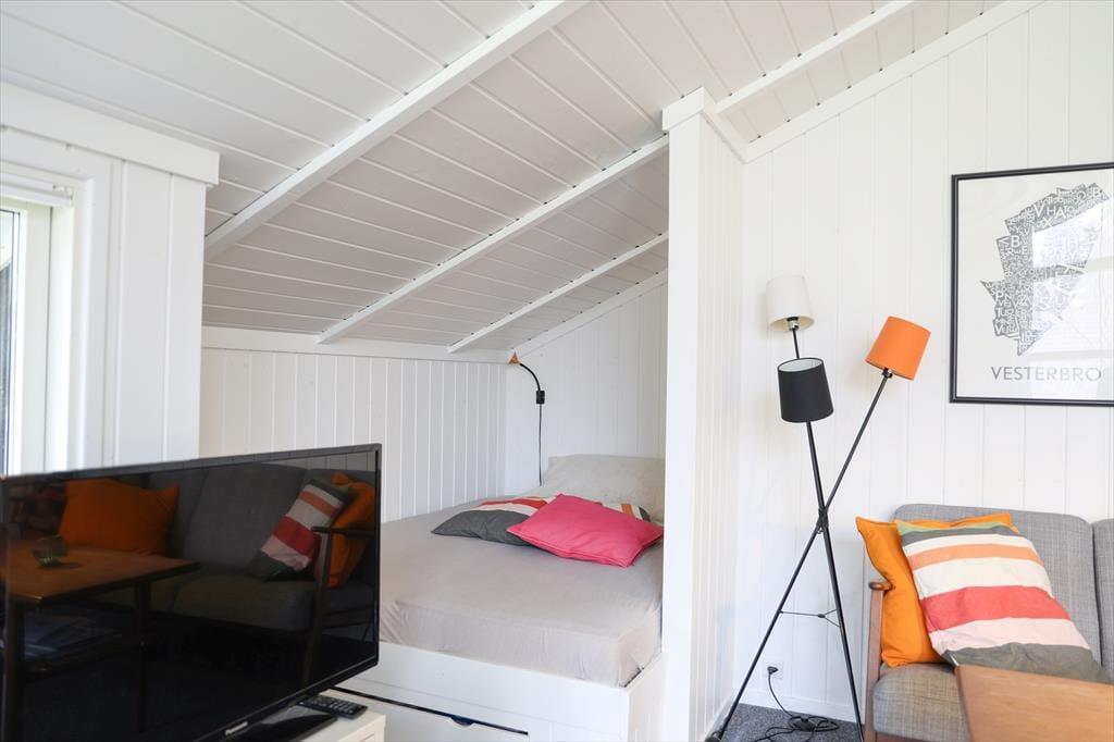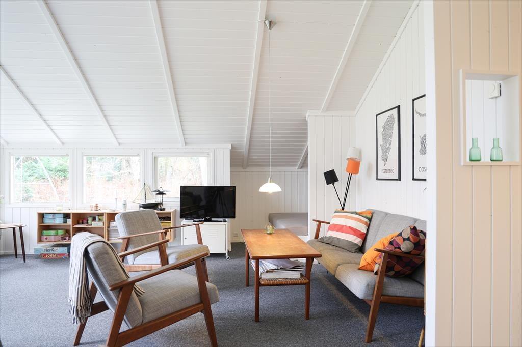 I sommerhuset, vil du med det samme få følelsen af at være velkommen, alt fremstår lyst og særdeles indbydende. Du vil hurtigt få skuldrene ned og mærke, at det endelig er tid til ferie. I den dejlige stue, der er placeret i forbindelse med det åbne køkken, kan I samles omkring spisebordet til et brætspil eller en god frokost. Fra terrassen kan du opleve den fantastiske natur og være heldig at se et rådyr gå forbi, mens I deler en flaske vin, efter at børnene er lagt i seng.