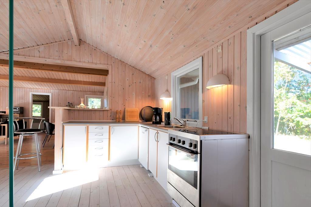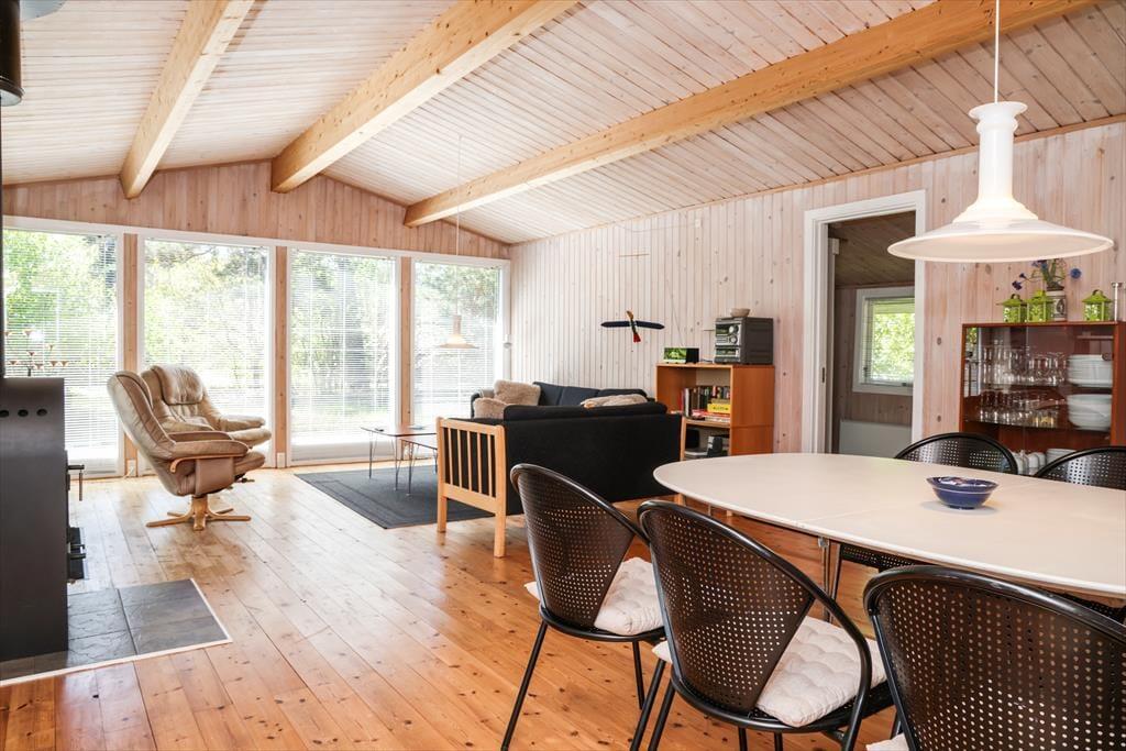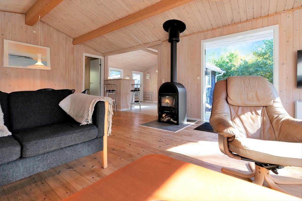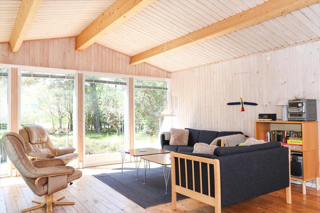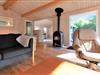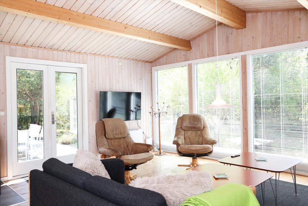 Indendørs fornemmer i rummeligheden i dette skønne sommerhus. Der er luft og albuerum i den store stue, hvor alle kan samles omkring sofabordet. Herfra kan den skønne naturgrund nydes, da der er en dejlig udsigt til haven fra det store vinduesparti. Hvad enten madlavningen er fælles eller du har vundet opgaven, så kan du stadig være en del af fællesskabet, da køkkenet ligger i åben forbindelse med stue.