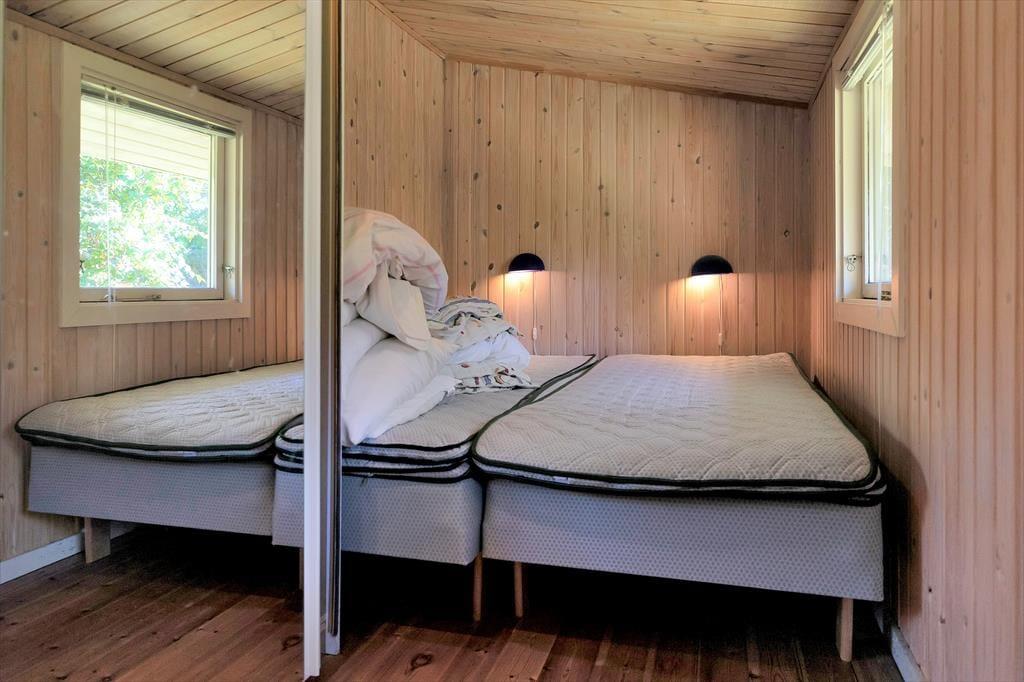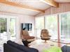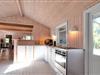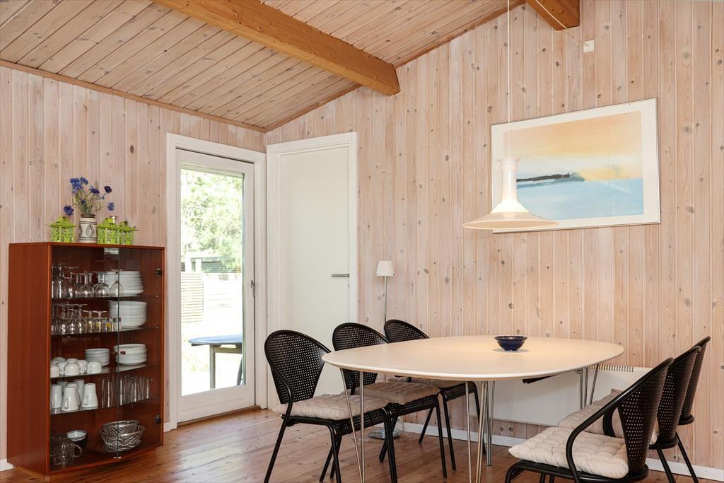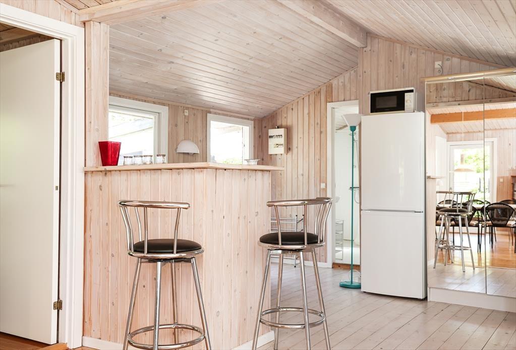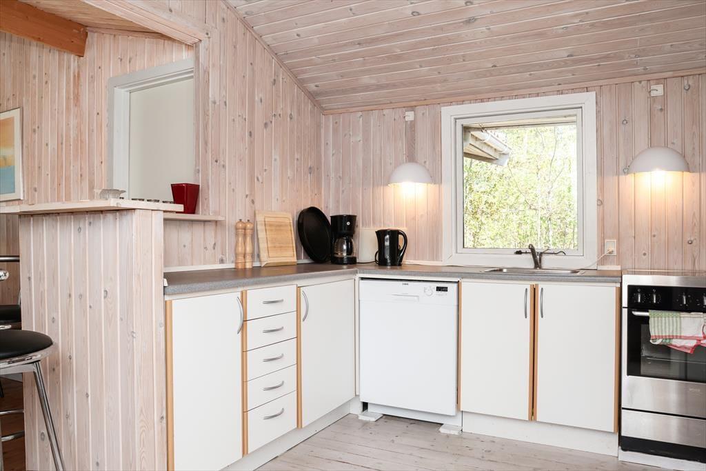 Indendørs fornemmer i rummeligheden i dette skønne sommerhus. Der er luft og albuerum i den store stue, hvor alle kan samles omkring sofabordet. Herfra kan den skønne naturgrund nydes, da der er en dejlig udsigt til haven fra det store vinduesparti. Hvad enten madlavningen er fælles eller du har vundet opgaven, så kan du stadig være en del af fællesskabet, da køkkenet ligger i åben forbindelse med stue.