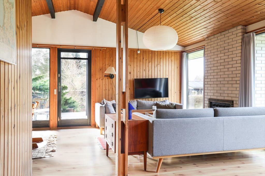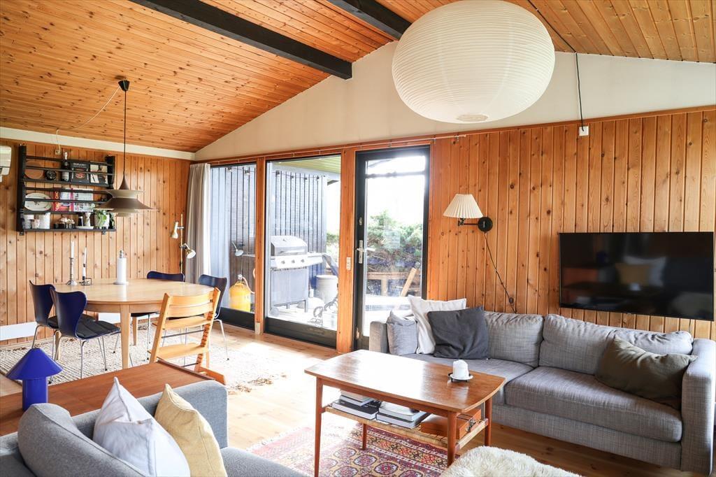 Husets dagligstue ligger i forbindelse med det åbne køkken, så mens nogle i familien slapper af i sofaen, kan du tænde ovnen og gøre klar til aftenens steg. Der er også mulighed for at sætte sig og få en snak ved spisebordet eller spille et hyggeligt brætspil.