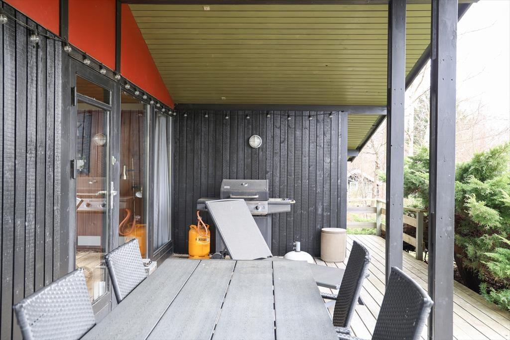 På den store terrasse kan du vælge enten at sidde i skygge under overdækningen eller flytte ud i den helt fantastiske gårdhave og bare nyde solen eller slappe af i en af liggestolene. Børnene kan kaste med bold eller spille medbragte havespil. Husk også at tilberede en gang snobrød over bålet - en skøn aktivitet for hele familien.