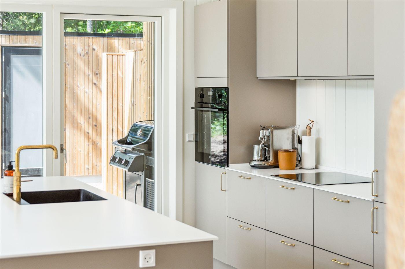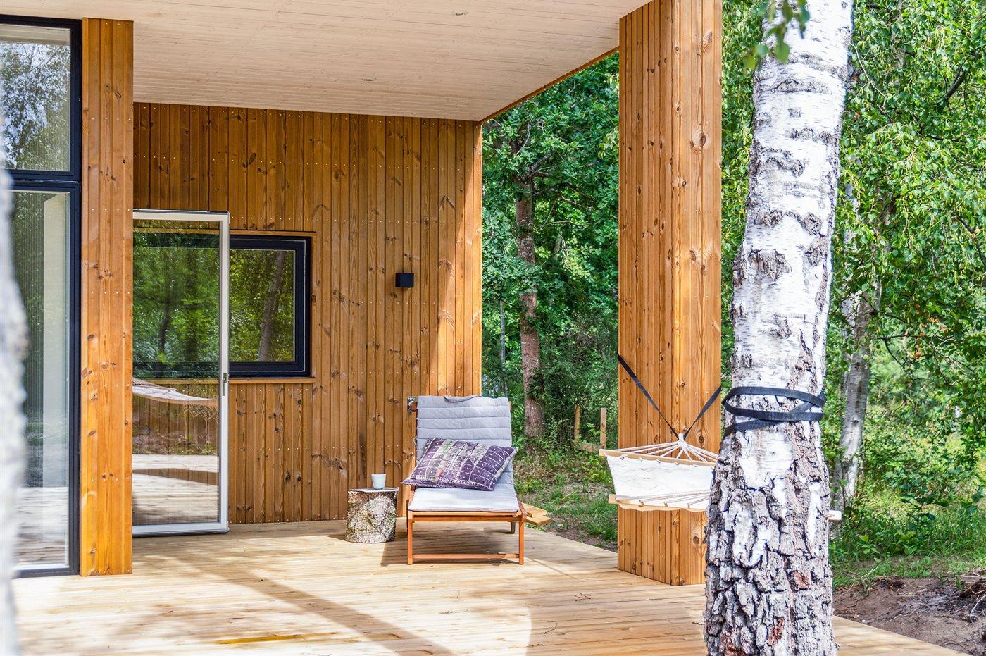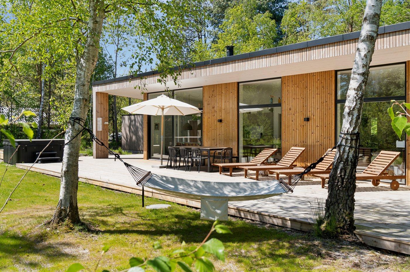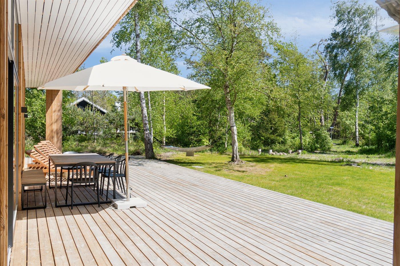 Huset er beliggende på en smuk naturgrund omkranset af beplantning og med gode store og delvist overdækket terrasseområder med udebruser (til rådighed fra uge 14 til og med uge 45) – her er der god mulighed for at nyde solen og for at finde læ og skygge.