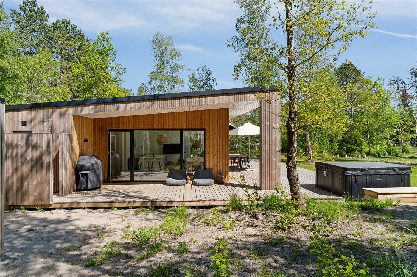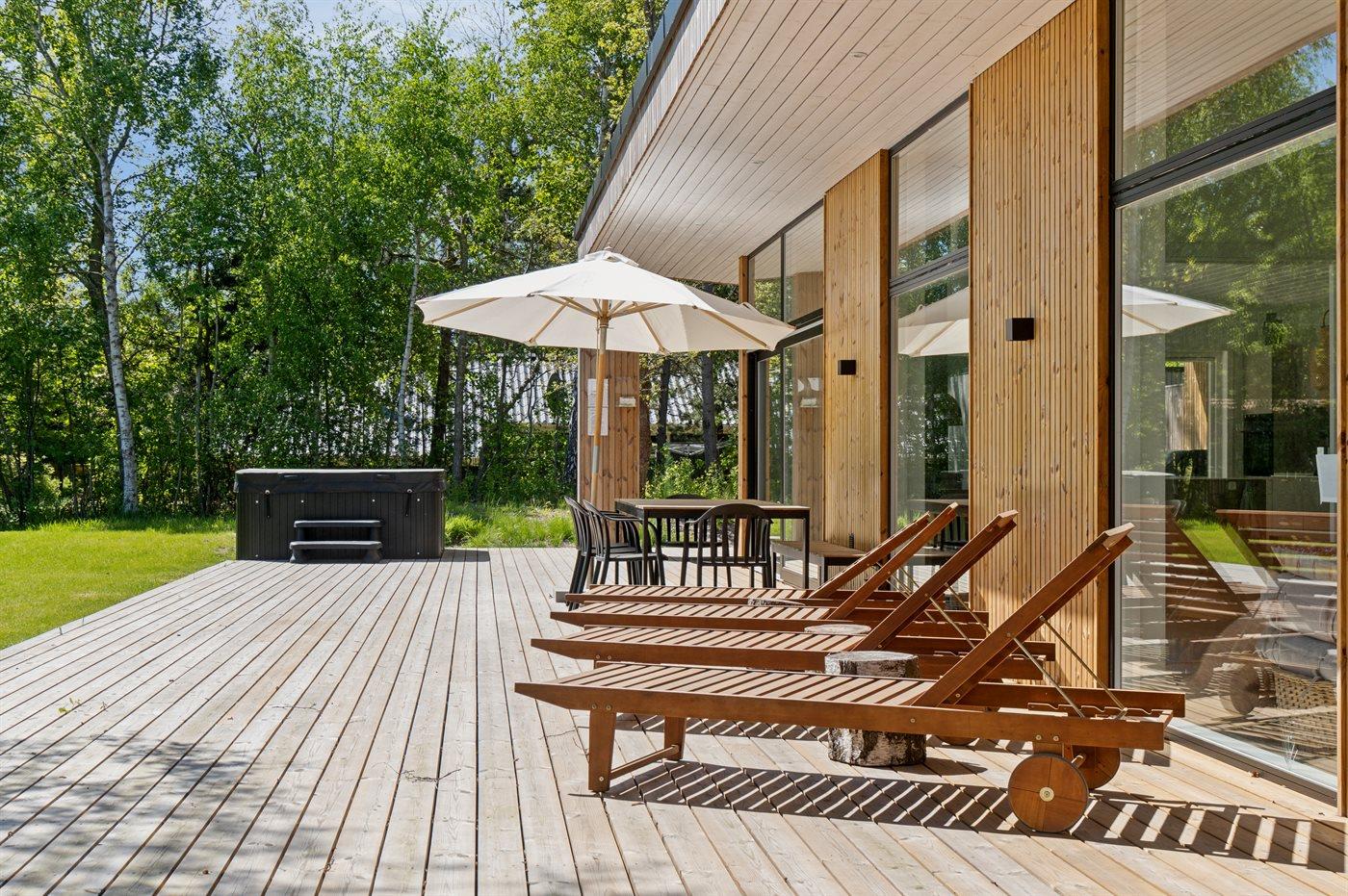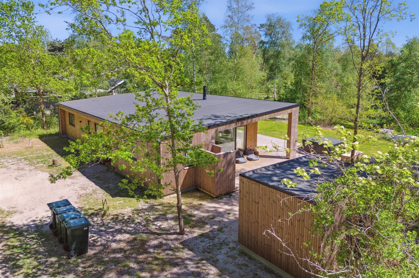Dette nyopførte aktivitetshus fra 2023 har udendørs spa til 6 personer og indendørs sauna. Huset er udført i et moderne design med masser af lys og luft og i materialer af høj kvalitet.