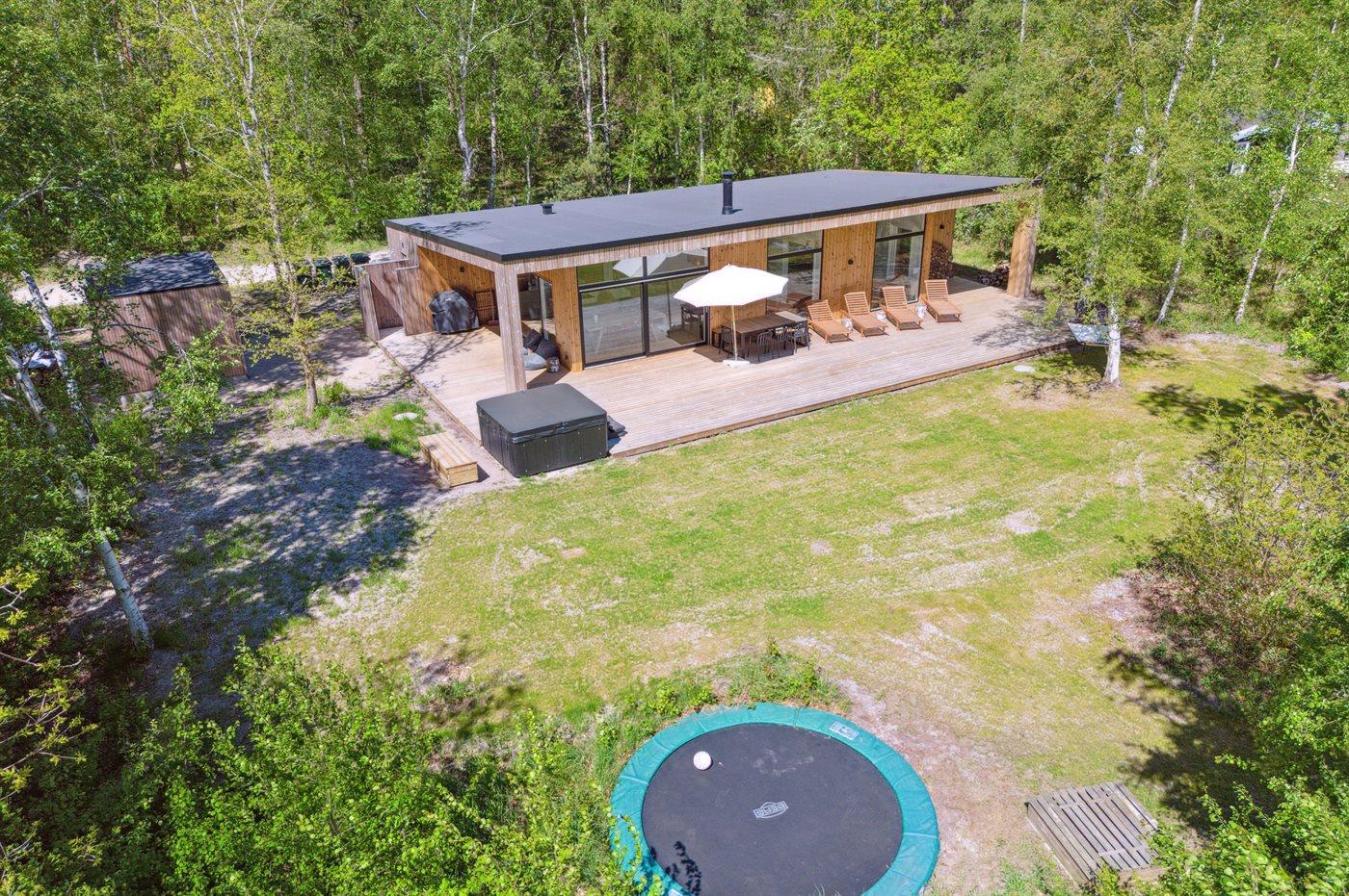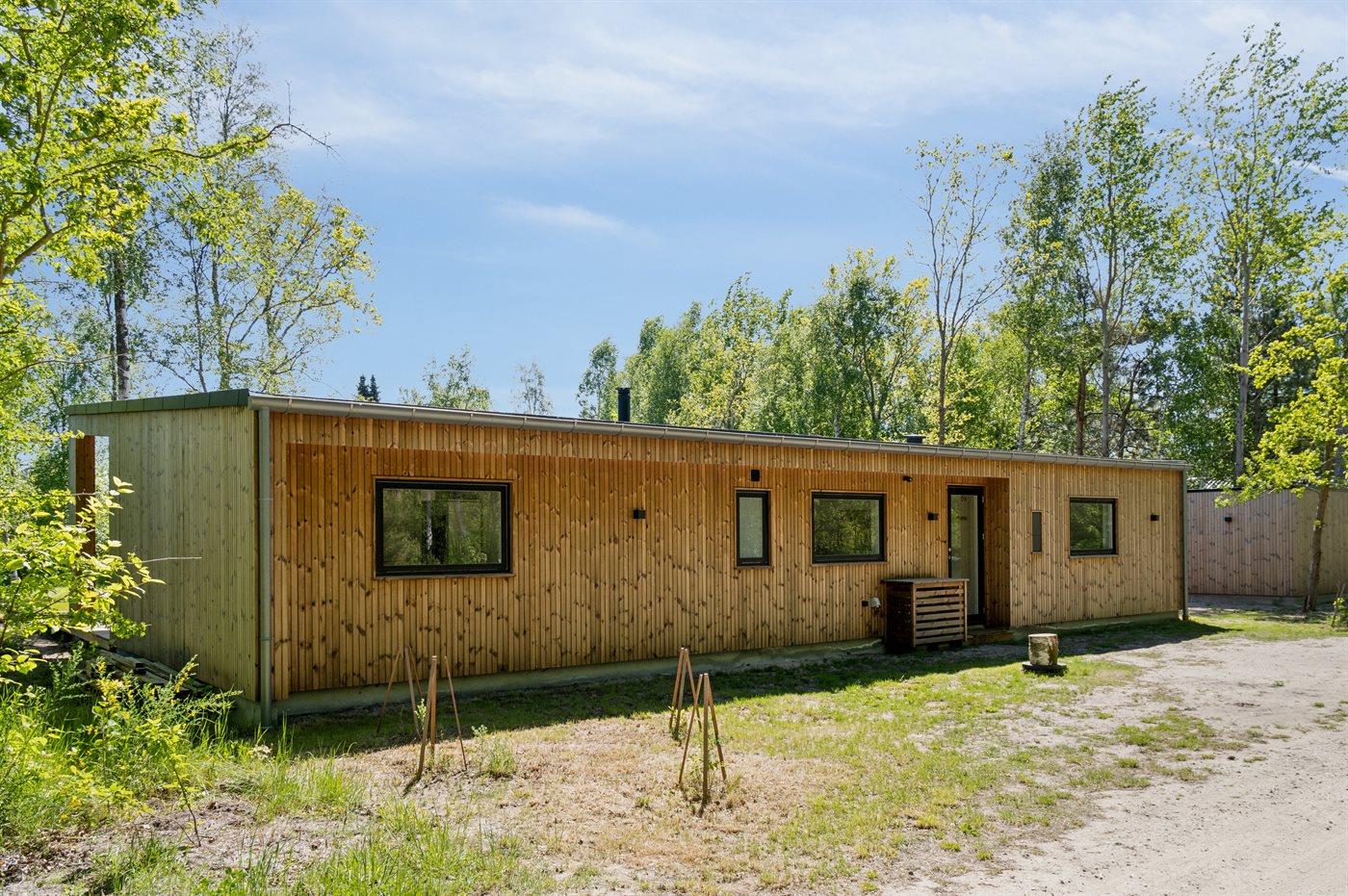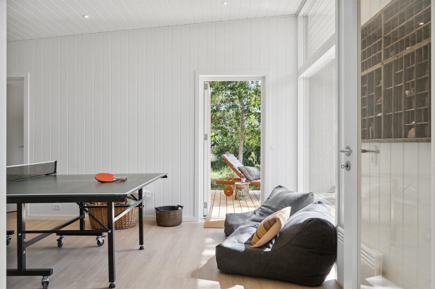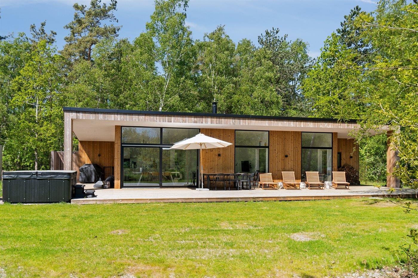 Dette nyopførte aktivitetshus fra 2023 har udendørs spa til 6 personer og indendørs sauna. Huset er udført i et moderne design med masser af lys og luft og i materialer af høj kvalitet.