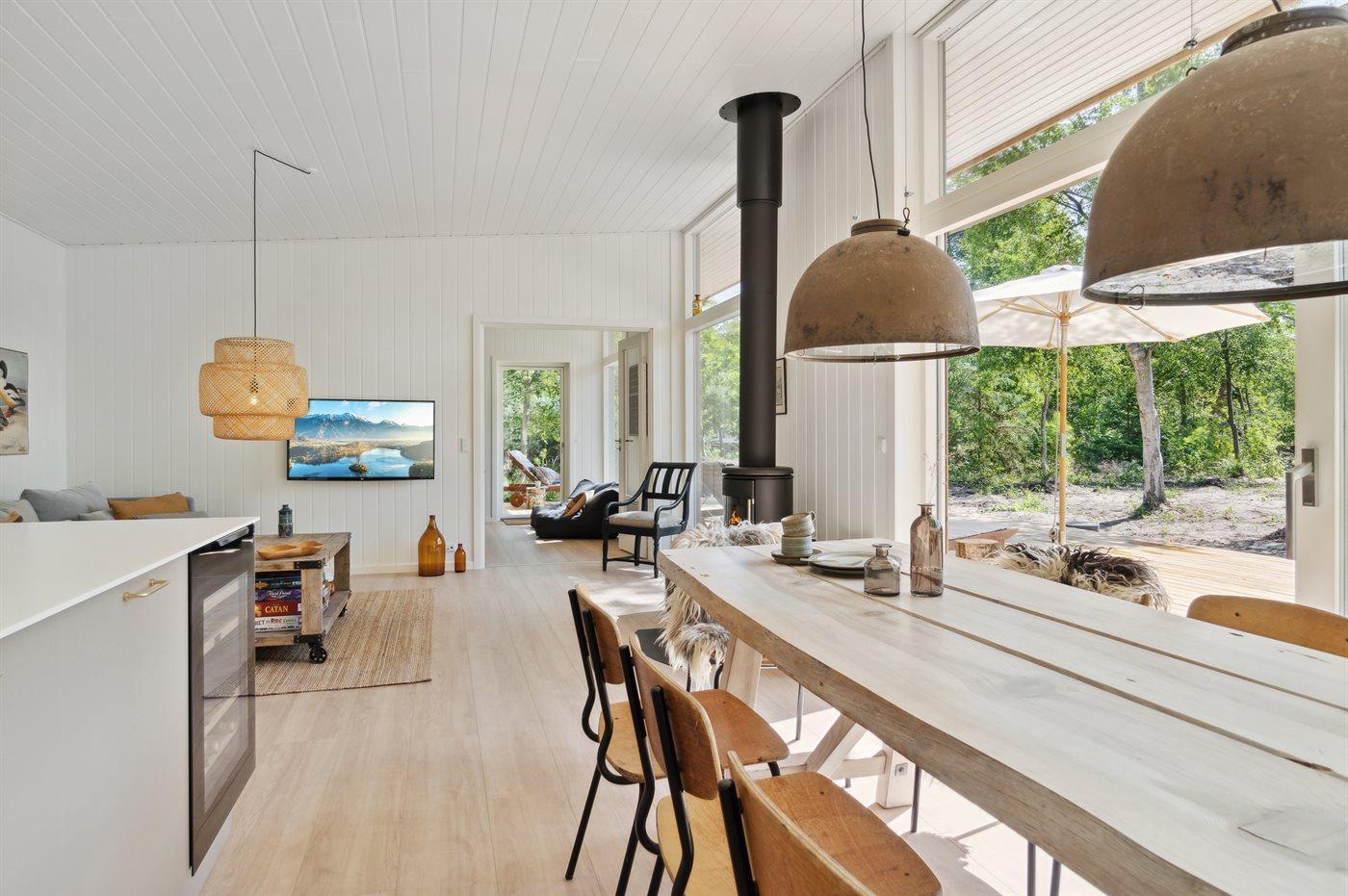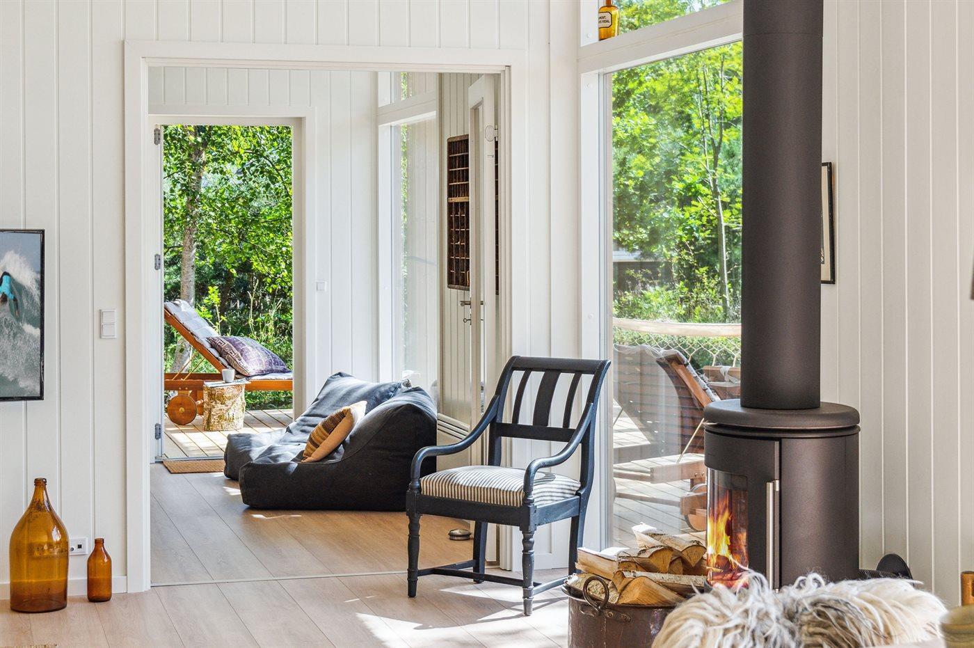 Husets centrale rum er det moderne køkkenalrum med køkken, spiseplads og stue som ligger ud i ét. I husets aktivitetsrum er der mulighed for at hygge sig og spille bordtennis, Nintendo Wii og Pitjau. På terrassen findes der desuden bordfodbold. Til de små er der en sandkasse. Der er 4 værelser med hver 2 sovepladser. Der er 2 badeværelser med bruseniche og gulvvarme. I det ene badeværelse er der sauna. I entreen findes vaskemaskine og tørretumbler. Der er installeret ladestik til elbiler.