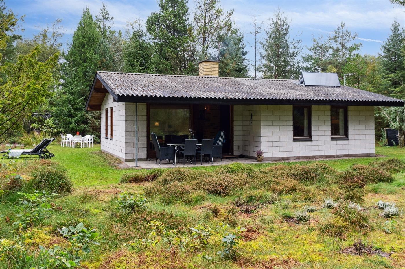 Dette hyggelige sommerhus er beliggende på en flot naturgrund omgivet af høje træer og delvist med lyng. Huset ligger i rolige og ugenerte omgivelser for enden af en lille, blind vej uden forbipasserende trafik. Børn kan derfor færdes trygt og sikkert.