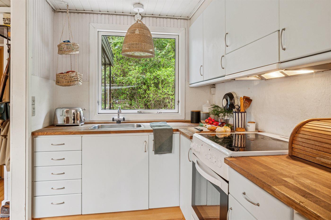 Sommerhuset er lyst, sommerligt og charmerende. Stuen med spiseplads og det hyggelige terrasseområde er de naturlige samlingssteder for hygge og samvær. Køkkenet grænser direkte op til stuen. Der er 2 soveværelser i selve sommerhuset som begge er med dobbeltsenge og et 1 i annekset også med dobbeltseng. Badeværelset er med bruser uden bruseniche. Der er vaskemaskine.
