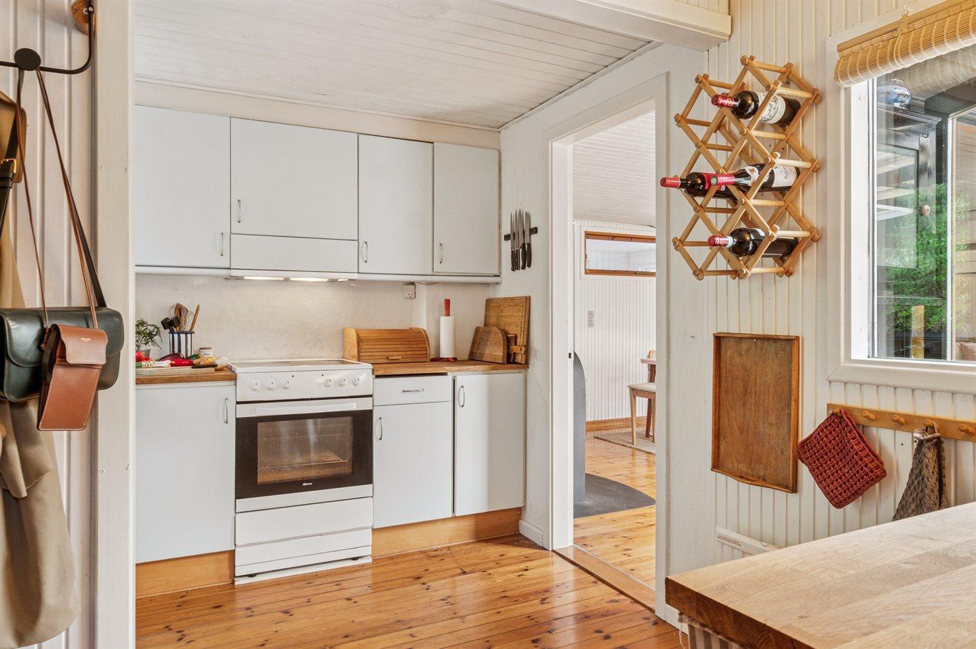 Køkkenet er udstyret med 1 køleskab. Der er 4 keramiske kogeplader, varmluftovn.