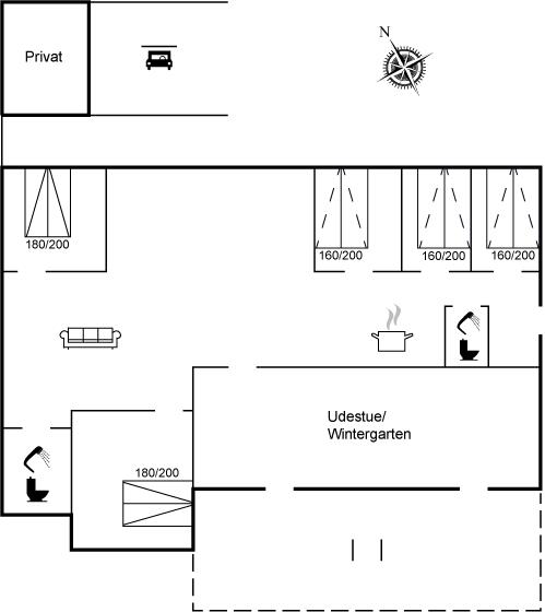 Der er 5 soveværelser med hver 2 sovepladser. I 2 af soveværelserne er der dobbeltsenge og i de resterende 3 soveværelser er der enkeltsenge, som kan skubbes sammen til dobbeltsenge. Der findes 2 badeværelser, begge med bruseniche og gulvvarme. Det ene badeværelse er renoveret i 2025. I udhuset findes der tørretumbler samt 1 ekstra køleskab.
