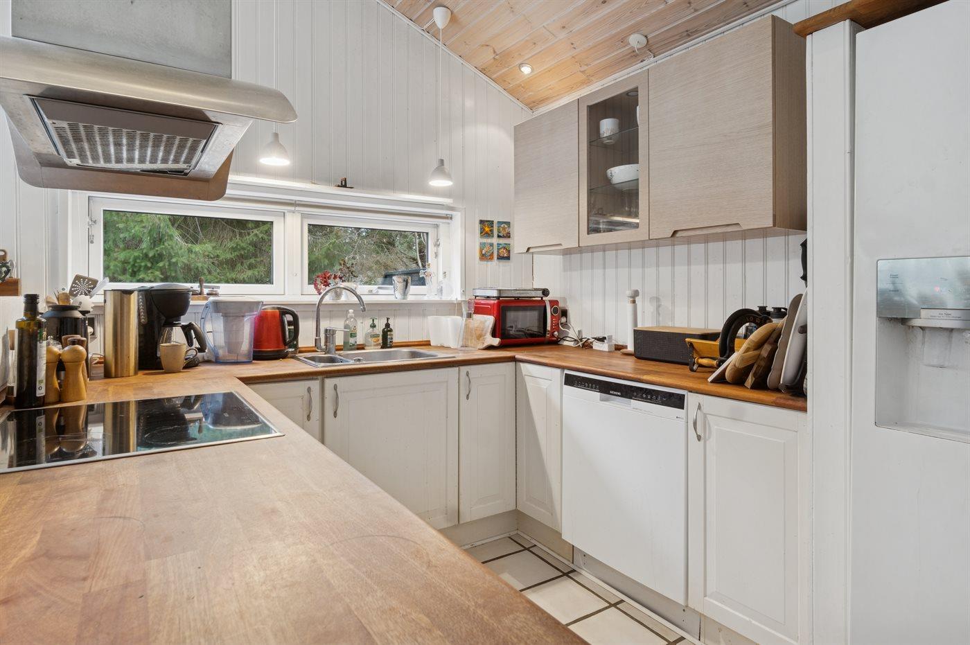 Køkkenet er udstyret med 1 amerikansk køleskab. Der er 4 keramiske kogeplader, varmluftovn, mikrobølgeovn samt opvaskemaskine Der er gulvvarme i køkkenet.