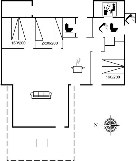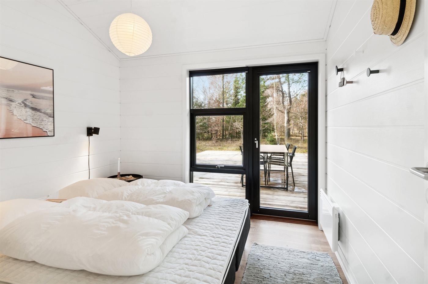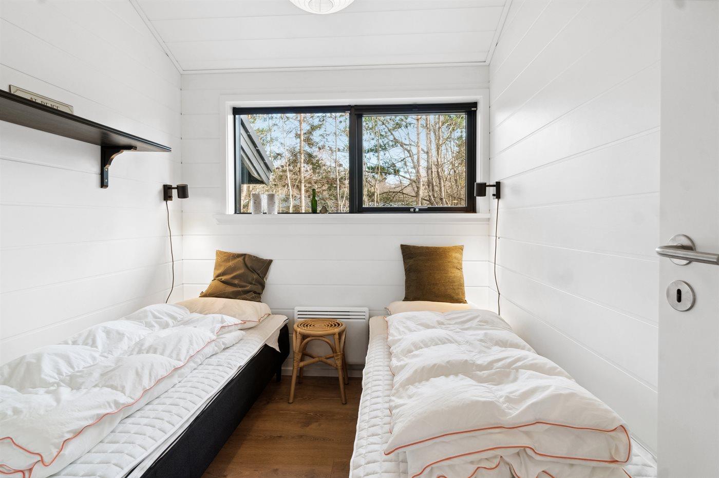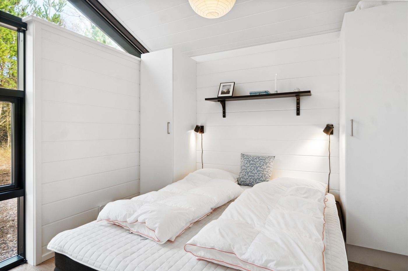 Der er i alt 3 soveværelser. Sovepladserne fordeler sig på: 4 sovepladser i dobbeltsenge. 2 sovepladser i enkeltsenge. 2 sovepladser på madrasser. 2 af disse sovepladser befinder sig på husets hems.