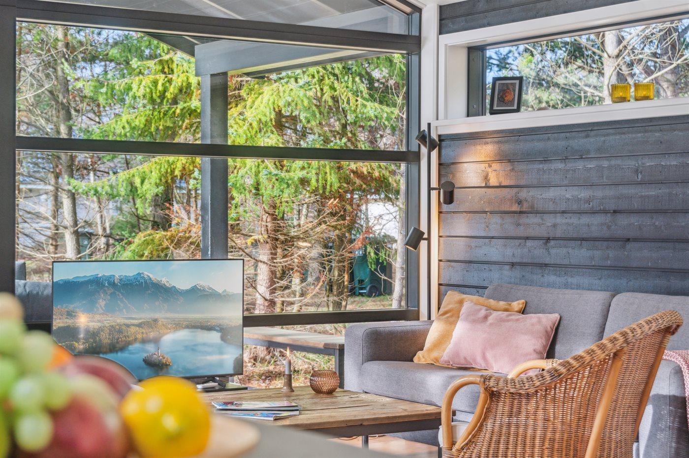 Huset er lyst og moderne med masser af lysindfald fra de store vinduespartier, og alle materialer er af høj kvalitet. Indretningen er moderne og sommerlig, og der er loft til kip i alle rum. Her er komfort og luksus, og overalt er huset hyggeligt, rart og bekvemt at være i.