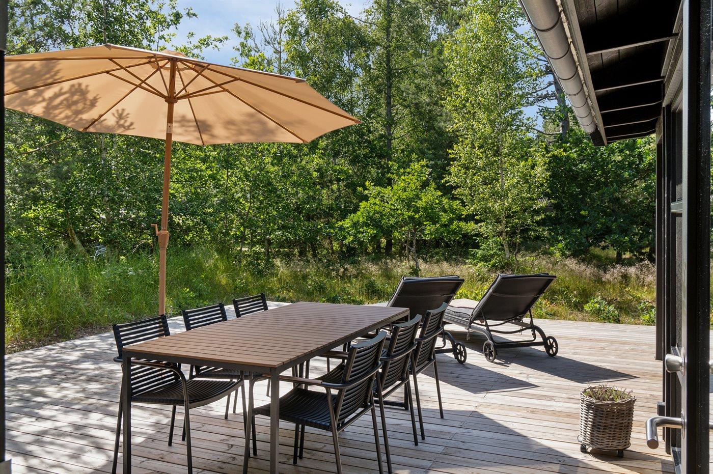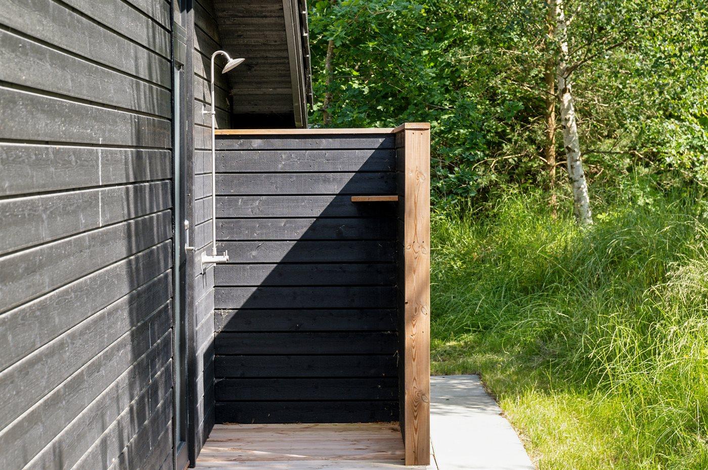 Ferieboligen er beliggende på en 1363 m² stor naturgrund. Der er 800 m til havet. Nærmeste forretning er beliggende i en afstand af 350 m. Der er en golfbane i en afstand af 6000 m. Til ferieboligen hører 65 m² terrasseareal. Desuden er der 23 m² overdækket terrasse. Udendørs bruser. Grill til rådighed. Der er installeret stik til opladning af elbil. Type 2 stik. Med 11 kW ladeeffekt. Parkering ved ferieboligen.