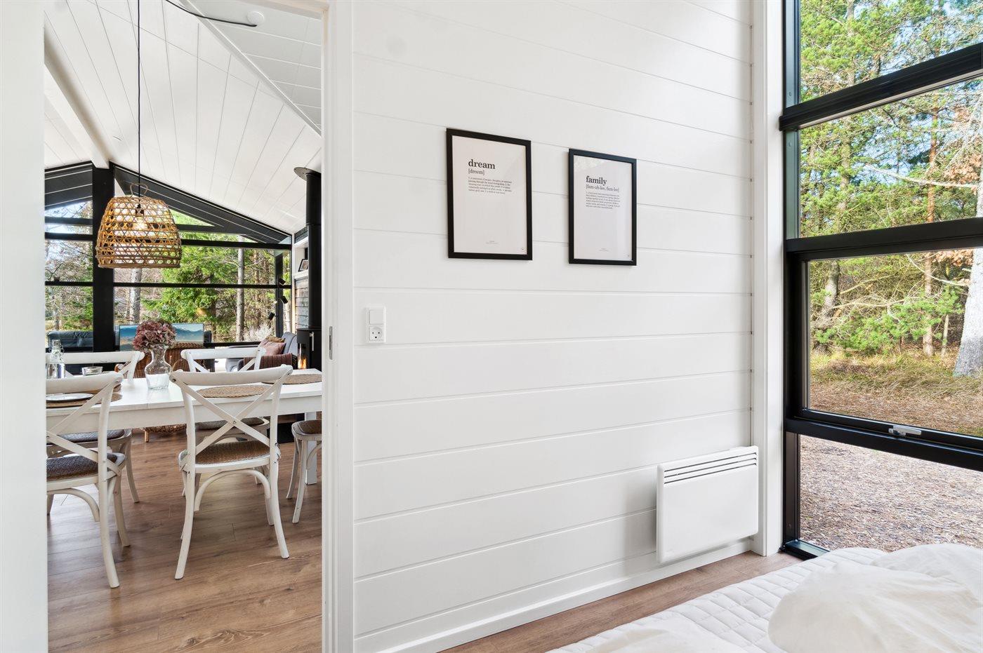 Der er 3 gode soveværelser med hver 2 sovepladser. Der er derudover 2 sovepladser på hemsen, som er bedst egnede til større børn. Der er mulighed for at tage madrasserne fra hemsen ned på gulvet i huset. Der er 1 badeværelse og 1 gæstetoilet, som begge har gulvvarme. Badeværelset har desuden bruseniche og sauna, og herfra er også udgang til udebruser. Huset opvarmes energivenligt med luft-til-luft varmepumpe, og der er ladestation til elbiler.